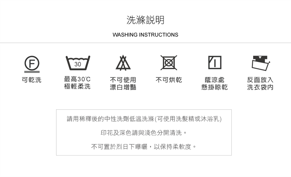 ► 寢具(被套、床包、枕頭套)皆可水洗,清洗時請翻反面,拉上拉鍊(留5公分左右開口),以冷水稀釋「非酵素型中性洗劑」後清洗,不可浸泡,避免使用烘乾機。