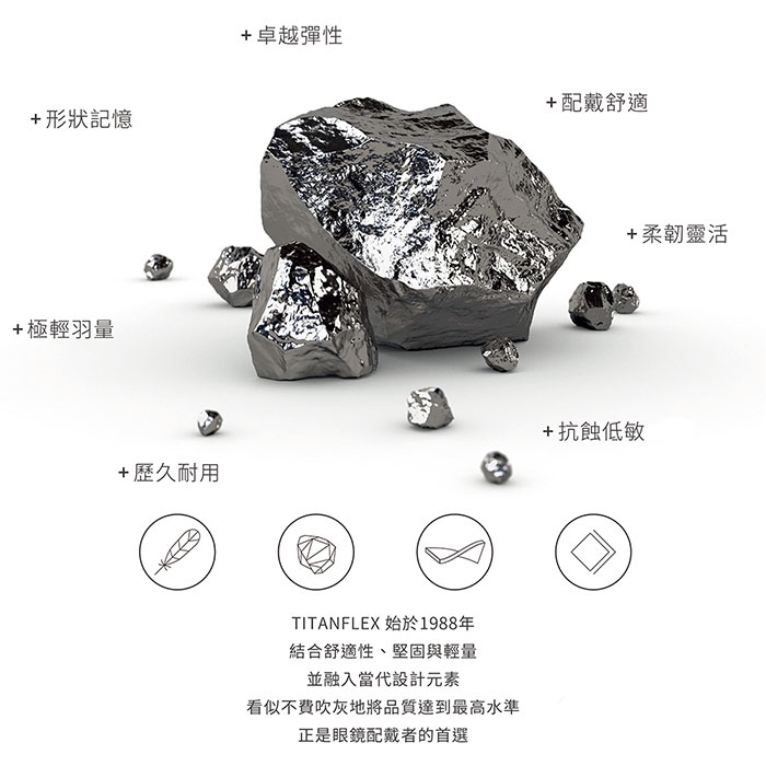 德國 Eschenbach 設計工藝【TITANFLEX 超彈性鈦】科技始於 1988 年,主要應用於鏡框鼻橋、鏡腳處。2012 年榮獲德國 iF 材料設計獎 (iF material design award)、德國紅點設計獎 (red dot design award),優於市面上的 β鈦 (Beta Titanium) 產品。具有形狀記憶的獨特材質,結合堅固、靈活、輕量,提供完美的貼合性與出色的舒適性,並融入當代設計元素,看似不費吹灰地將品質達到最高水準,正是眼鏡配戴者的首選。