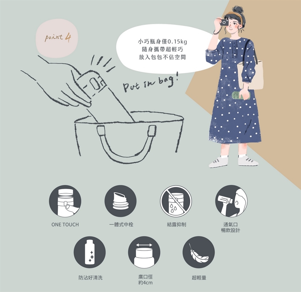 (4) 結露抑制,放進包包也不擔心溼答答。