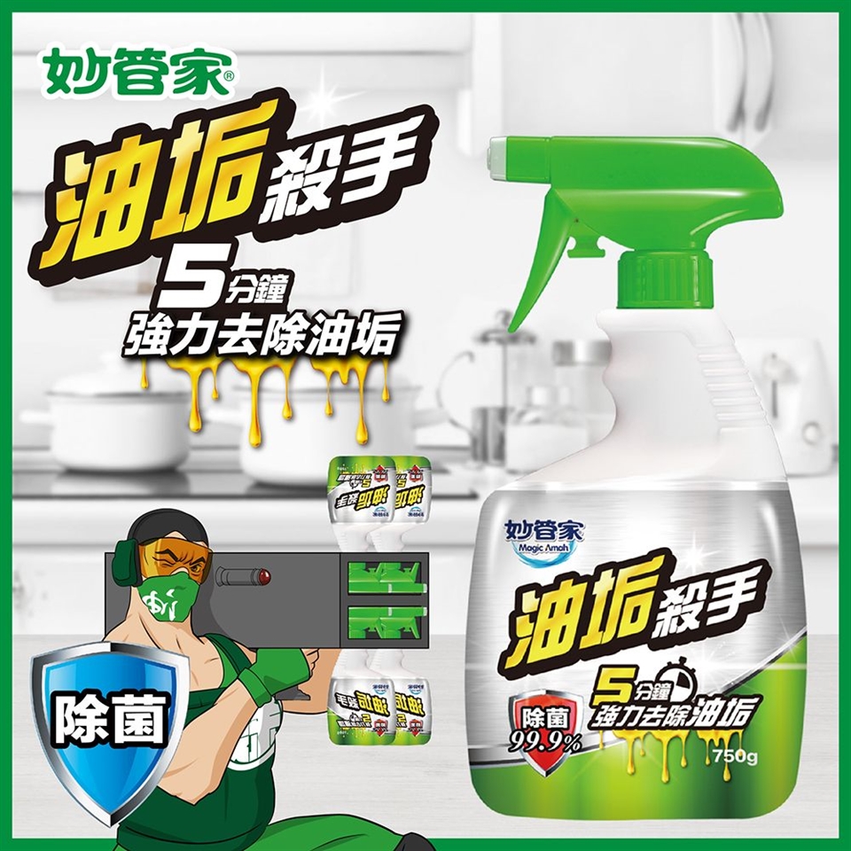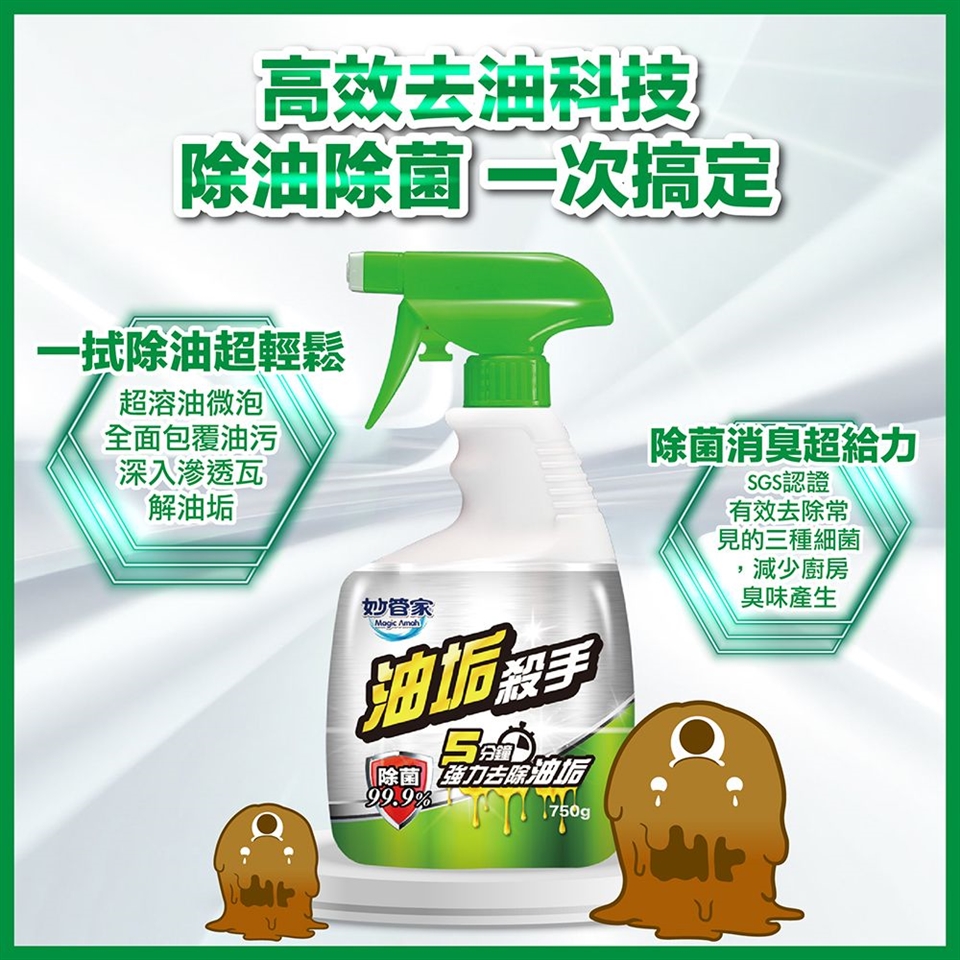 強力除油:高效溶油微泡全面包覆表面油污,深入滲透油垢,有效去除難以清潔的油污、焦漬,垂直區域也能有效清潔。
