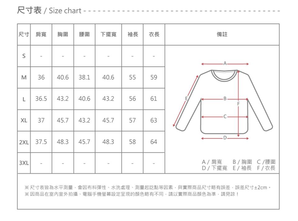 ※本尺寸表會因布料彈性、水洗處理、量測起訖點、人為拉扯等因素,與實際商品略有誤差。
