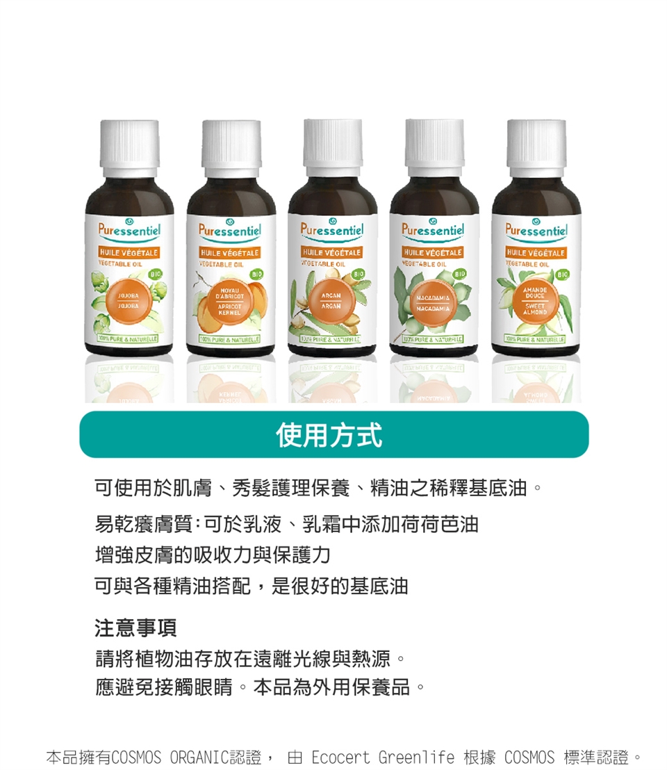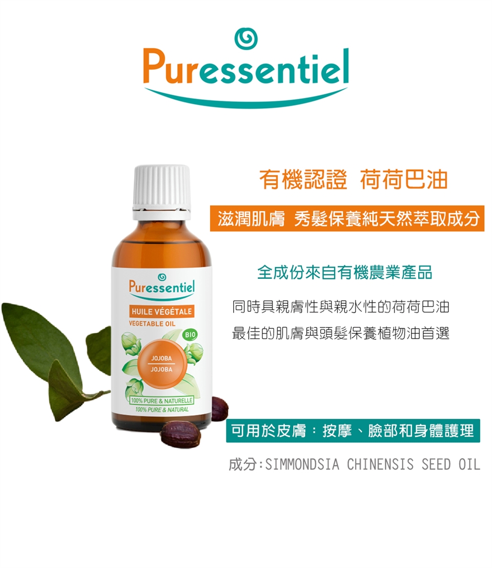 有機認證荷荷巴植物油, 100% 純天然萃取成分,未添加任何保存劑、亦未稀釋。