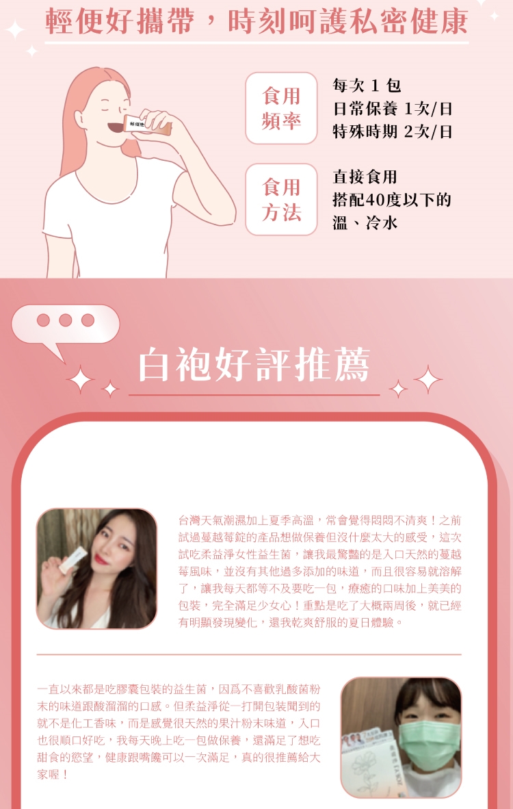 成份:D-甘露醇(甜味劑)、乳糖菌凍乾品(Lactobacillus plantarum,Lactobacillus crispatus,Lactobacillus rhamnosus,Lactobacillus reuteri,Lactobacillus gasseri,Lactobacillus acidophilus,Lactobacillus johnsonii,)、D-山梨醇(甜味劑)、乳糖(乳糖、麥芽糊精)、蔓越莓粉(蔓越莓萃取物、麥芽糊精)、麥芽糊精、鋅酵母、二氧化矽、蔓越莓萃取物、半乳寡糖、果寡糖、DL-蘋果酸、維生素D3{辛烯基丁二酸鈉澱粉、蔗糖、L-抗壞血酸鈉(抗氧化劑)、中鏈三酸甘油酯、二氧化矽、生育醇(抗氧化劑)、維生素D3}、茶胺酸、葉酸