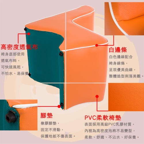 各大幼稚園、圖書館最推薦的實用可愛沙發椅凳就是這款多彩造型椅。一般布質沙發椅凳最頭庝的就是怕髒,這款造型椅皮面採PVC材質,防水又耐髒,不怕小孩子不小心打翻水,或者坐久會有髒污,用溼布即能清理。皮面內包覆軟質泡棉,軟硬適中,讓您坐起來不感覺僵硬。L型椅背讓即使是小小的沙發凳也能讓您的背部稍微能得到支撐,坐起來更舒適。素面皮革簡單沒有多餘的綴飾,讓您更好搭配家中沙發或其他傢俱。六種顏色可選,看您是要沈穩的黑白色系,或者是亮一點的橘色、紫色讓空間氣氛更加活潑,都能符合您對色彩的需求。使用過的都推薦,不論是自家客廳、臥室或營業場所使用,各種空間都適用。台灣製造,品質更有保證。