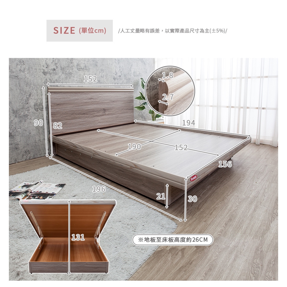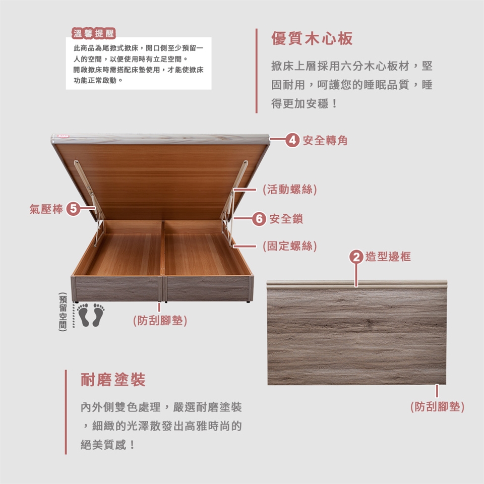 (2)尾掀式掀床的床尾需至少預留ㄧ人立足的空間,以便使用時有足夠操作空間,開啟掀床時需搭配床墊使用,才能使掀床功能正常啟動。
