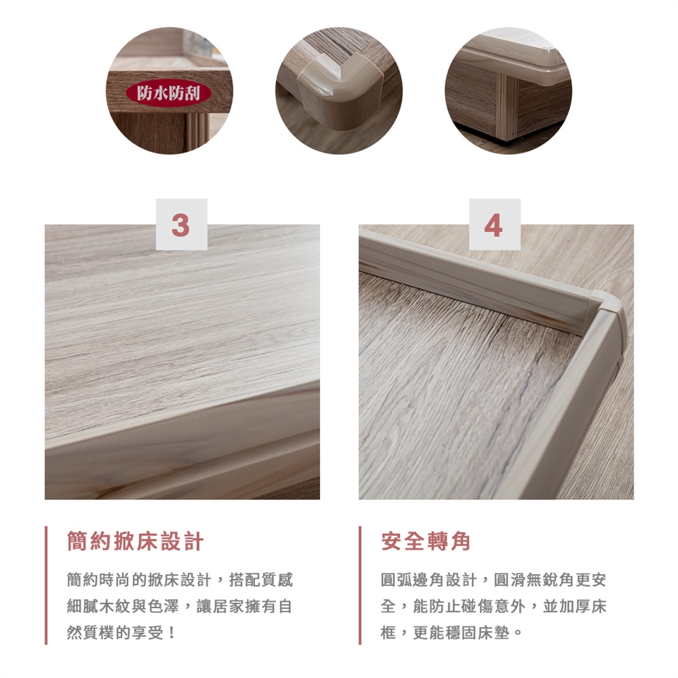 圓弧邊角設計,圓滑無銳角更安全,加厚式床框,穩固床墊防止滑動!