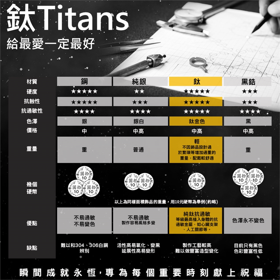 鈦金屬輕盈且抗過敏的特性,為您的肌膚帶來溫柔的呵護與舒適的佩戴體驗。
