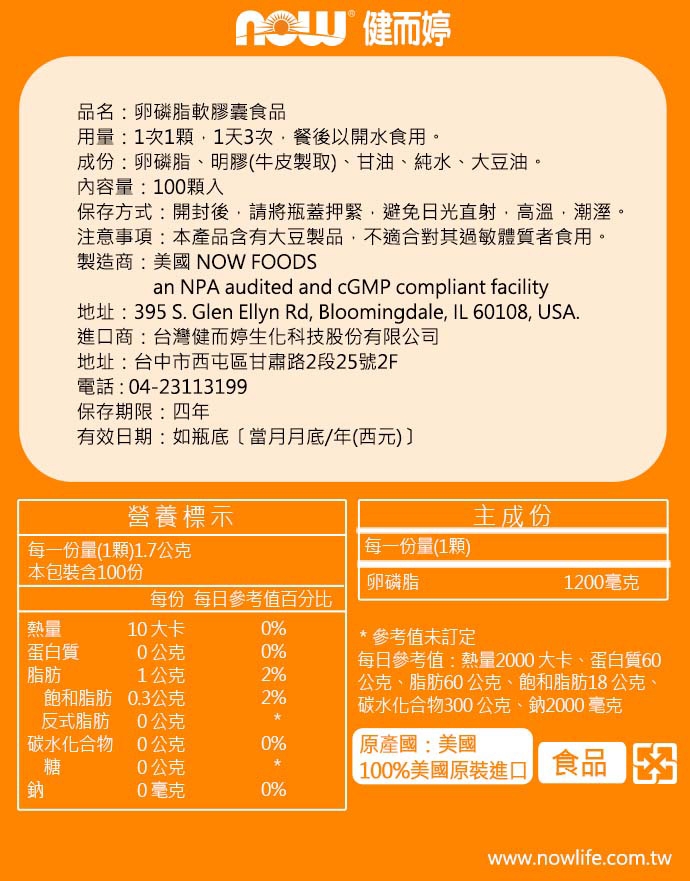 卵磷脂是從大豆中萃取,內含豐富膽鹼磷脂質(PC)、乙醇胺磷脂質(PE)、肌醇磷脂質(PI),為市售頂級產品,並有國際級GMP認證,安全健康、更好吸收,是您健康的絕佳選擇。