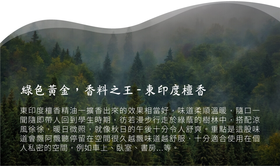 東印度檀香精油擴香出來的效果相當好,味道柔順溫暖,隨口一聞隨即帶人回到學生時期,彷若漫步行走於綠蔭的樹林中,搭配涼風徐徐,暖日微照,就像秋日的午後十分令人舒爽。重點是這股味道飄阿飄聽會停留在空間很久,越飄越舒服,十分適合使用在個人私密的空間,例如車上、臥室、書房...等,相信我,連我這麼挑剔味道都臣服在他餘韻之下。