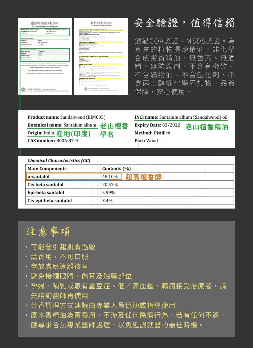 東印度檀香精油我們選擇配合的是有信譽的精油大廠,相信我,光是為了幫大家找出味道最好又有檢附檢驗報告的精油光是印度檀香精油試過不少於 30 家,繞了一大圈還是老牌子有信譽又有檢附報告的大廠味道最純正?,雖然價位不便宜但是一分錢一分貨,跟買珠寶一樣,不怕買貴,怕東西不對。