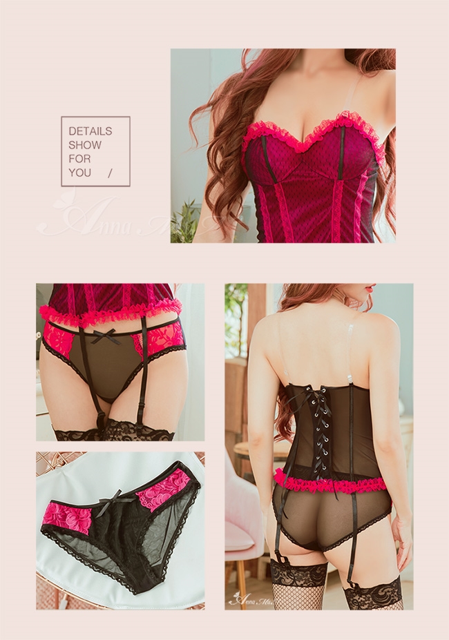 層層桃紅蕾絲點綴在胸口及馬甲下襬,