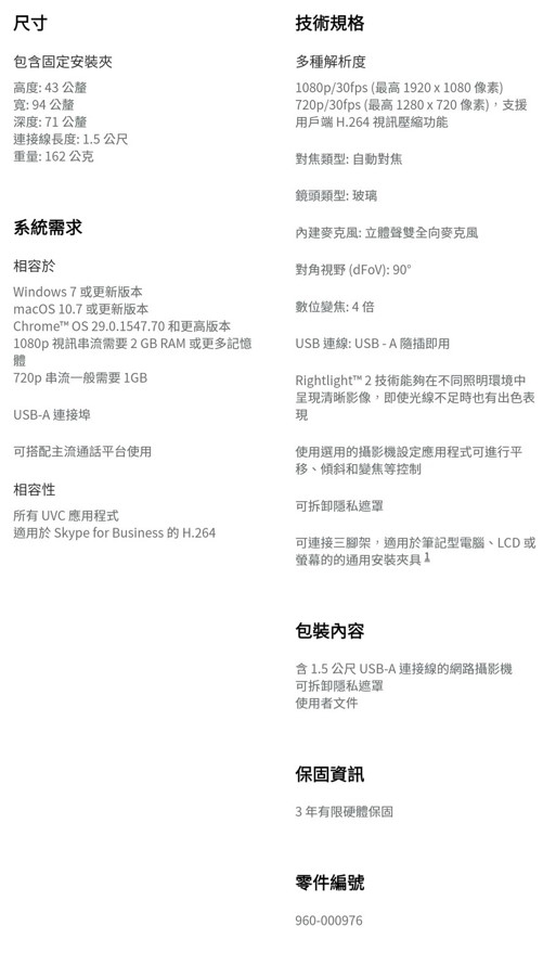 C930e 提供專業、可靠的視訊會議體驗。RightLight™ 2 增強了 HD 1080p/30 fps 視訊,還有可在任何環境提供飽滿、高解析度視訊品質的高精準鏡頭。優異的影像感應器提供始終如一的 HD 品質影像,即使變焦放大也不會出現鋸齒或模糊情況。
