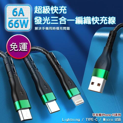 6A超級快充66W發光三合一編織快充線(Lightning /TYPE-C/ Micro USB)