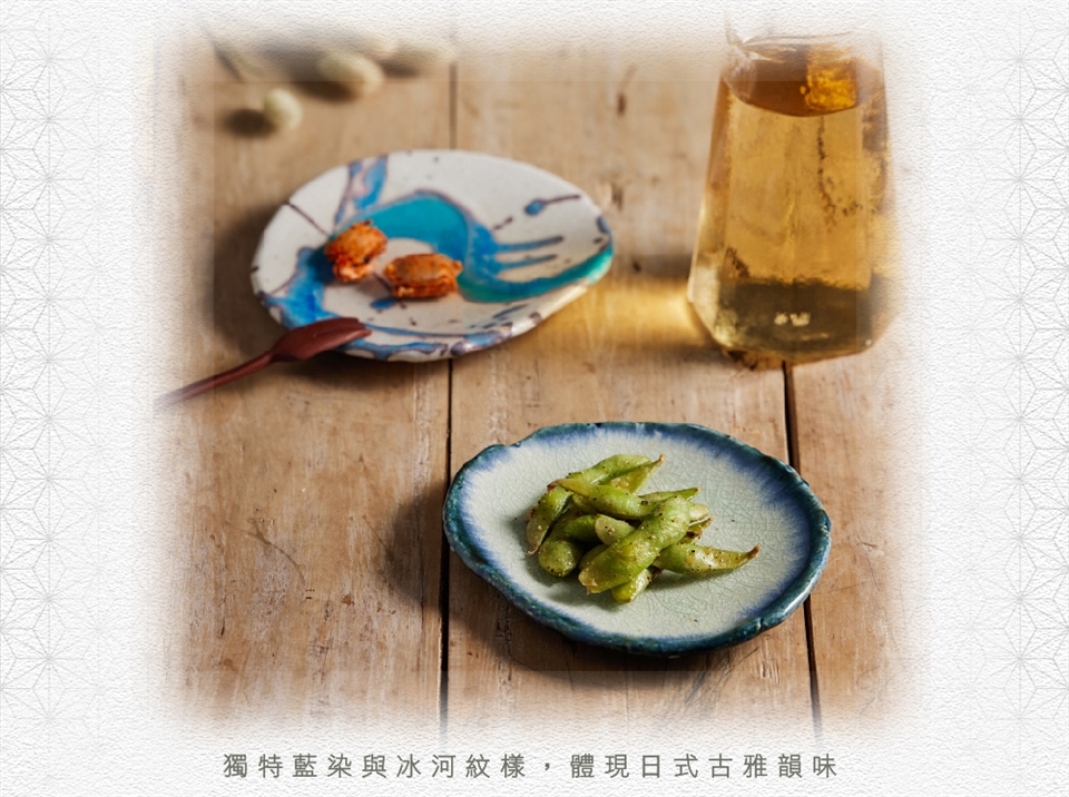 靛藍的藍染暈染在淺盤邊緣,原礦顆粒的
