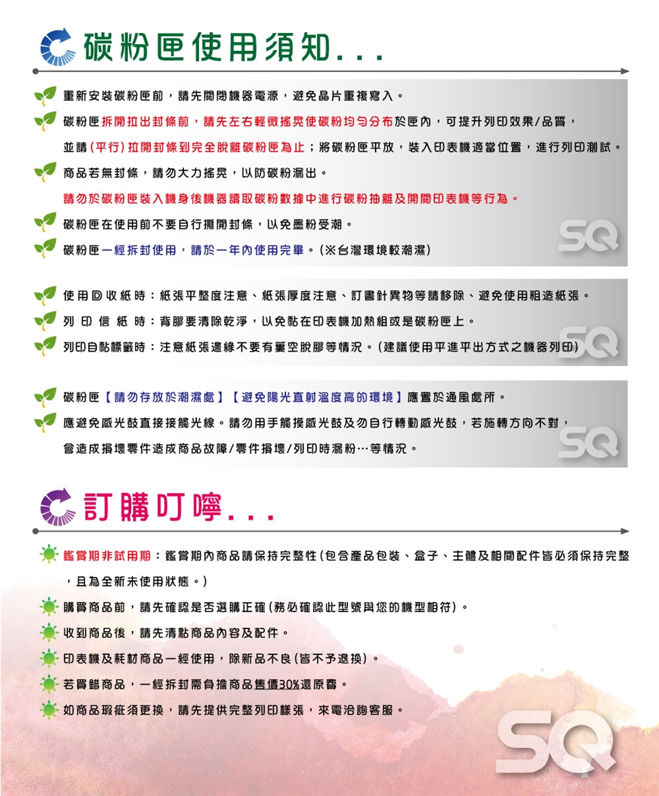 3.避免在高溫、高濕、高寒的環境下使用或存放,以免碳粉變質或故障,應置於通風處所。