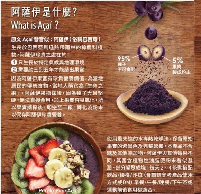 阿薩伊果(俗稱巴西莓)生長於亞馬遜河邊的棕櫚樹上。阿薩伊果為硬果實,無法直接食用,我們運用最先進水導熱乾燥法,保留原色及完整營養。 本產品不含糖及其他添加物,富含植物性油脂使粉末看似濕潤,部分凝聚成塊,每天早上或是運動前後食用一茶匙(本產品內附湯匙),食譜請參閱產品DM。