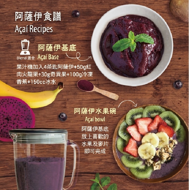 阿薩伊果(俗稱巴西莓)生長於亞馬遜河邊的棕櫚樹上。阿薩伊果為硬果實,無法直接食用,我們運用最先進水導熱乾燥法,保留原色及完整營養。 本產品不含糖及其他添加物,富含植物性油脂使粉末看似濕潤,部分凝聚成塊,每天早上或是運動前後食用一茶匙(本產品內附湯匙),食譜請參閱產品DM。
