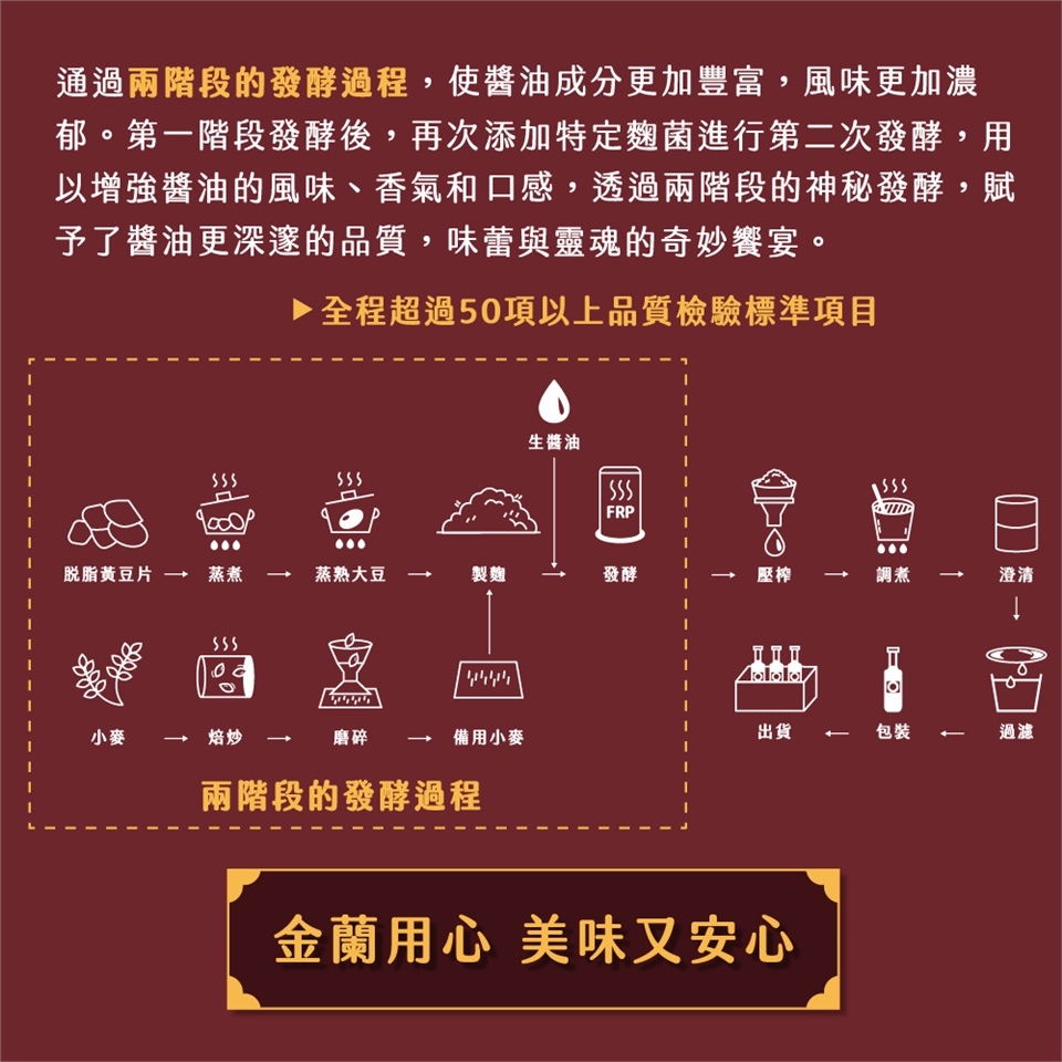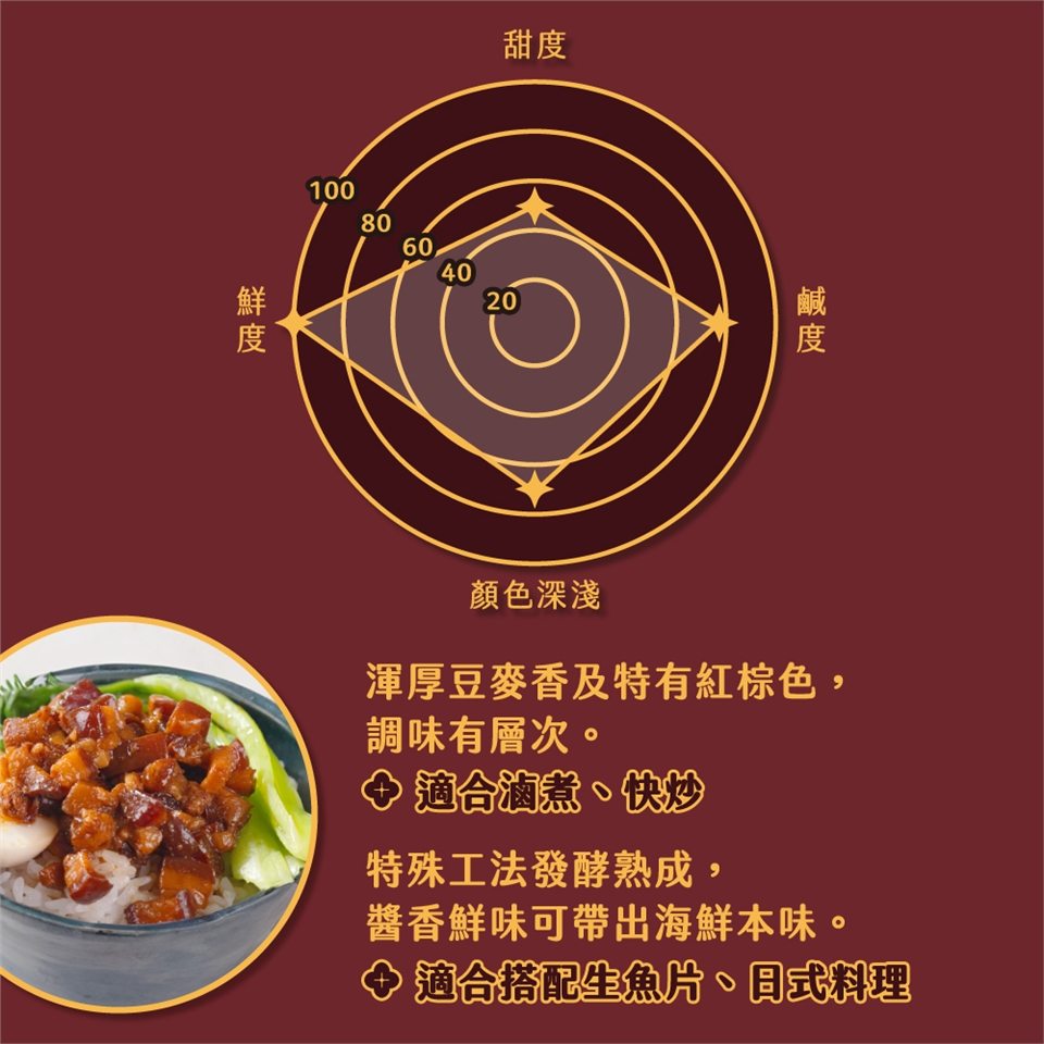 ◎ 金蘭二重釀技術,滴滴美味,適用於滷肉,料理呈現可口紅棕色
