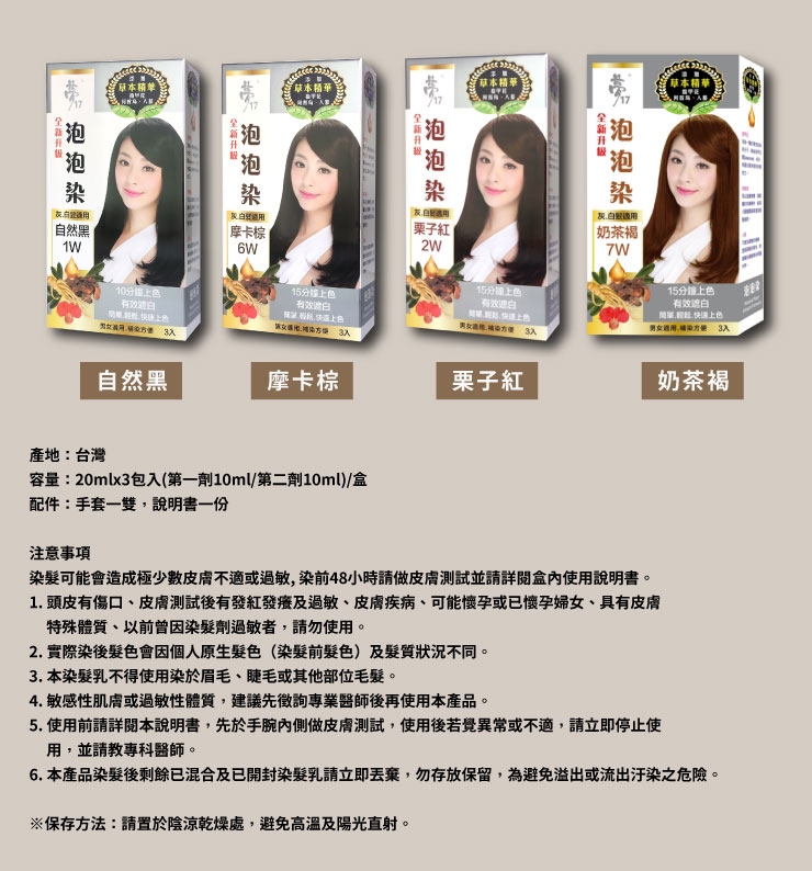 ※染髮可能會造成極少數皮膚不適或過敏, 染前48小時請做皮膚測試並請詳閱盒內使用說明書。