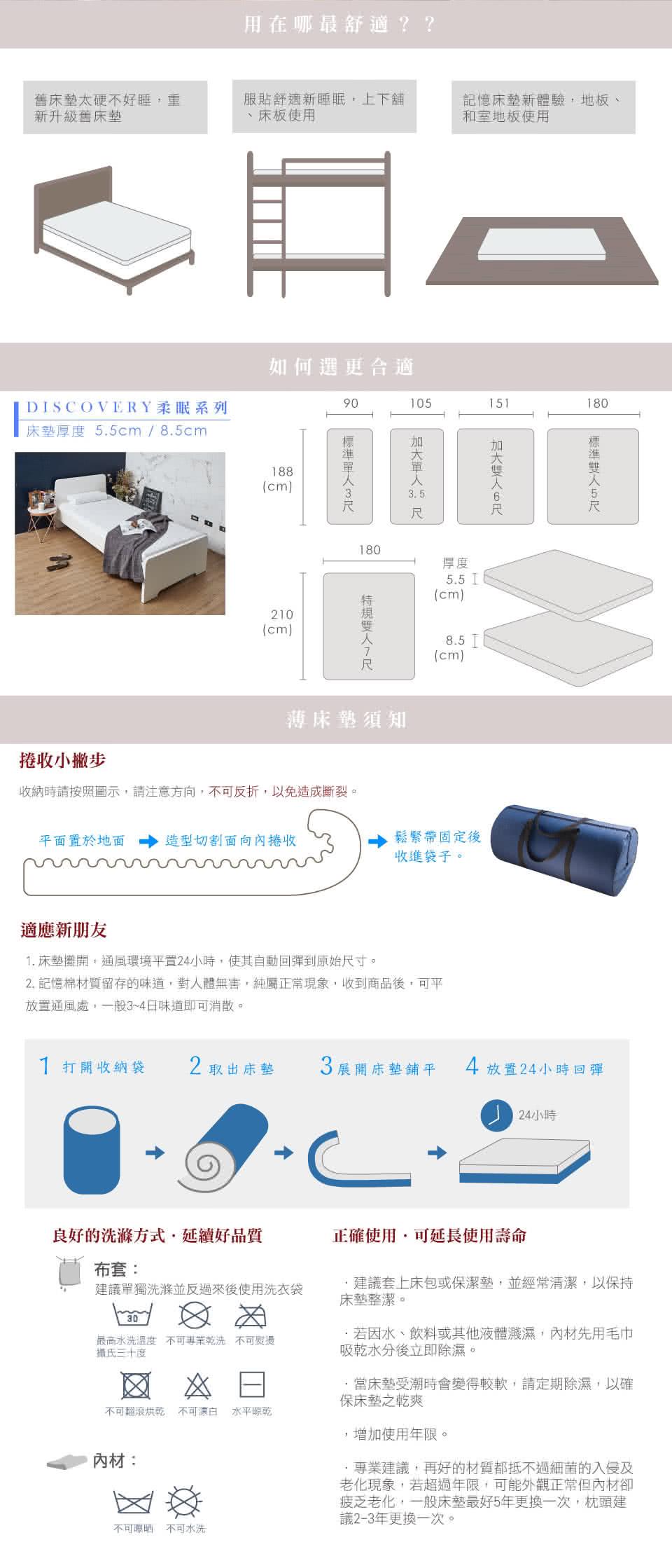 ◆洗滌方式:床墊內材不可曝曬、不可水洗;布套建議單獨洗滌並反過來後使用洗衣袋。