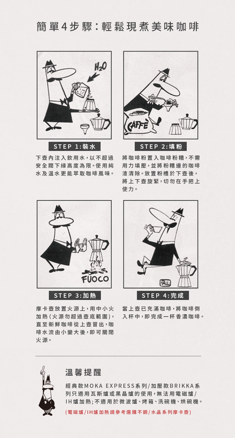 ※電火/不銹鋼/水晶系列摩卡壺適用於瓦斯爐、黑晶爐、電爐、電陶爐、電磁爐…等直火加熱;