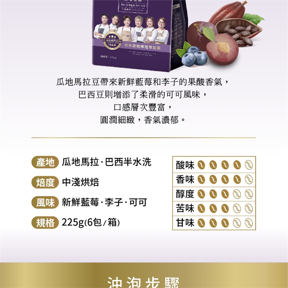 清新明亮的果香與醇厚的巧克力風味。瓜地馬拉豆帶來新鮮藍莓和李子的果酸香氣,巴西豆則增添了柔滑的可可風味,口感層次豐富,圓潤而細緻。香氣濃郁,每一口都帶來來自兩大產地的獨特精華,讓您享受每一次的咖啡體驗。中淺烘焙; 風味: 新鮮藍莓、李子、可可