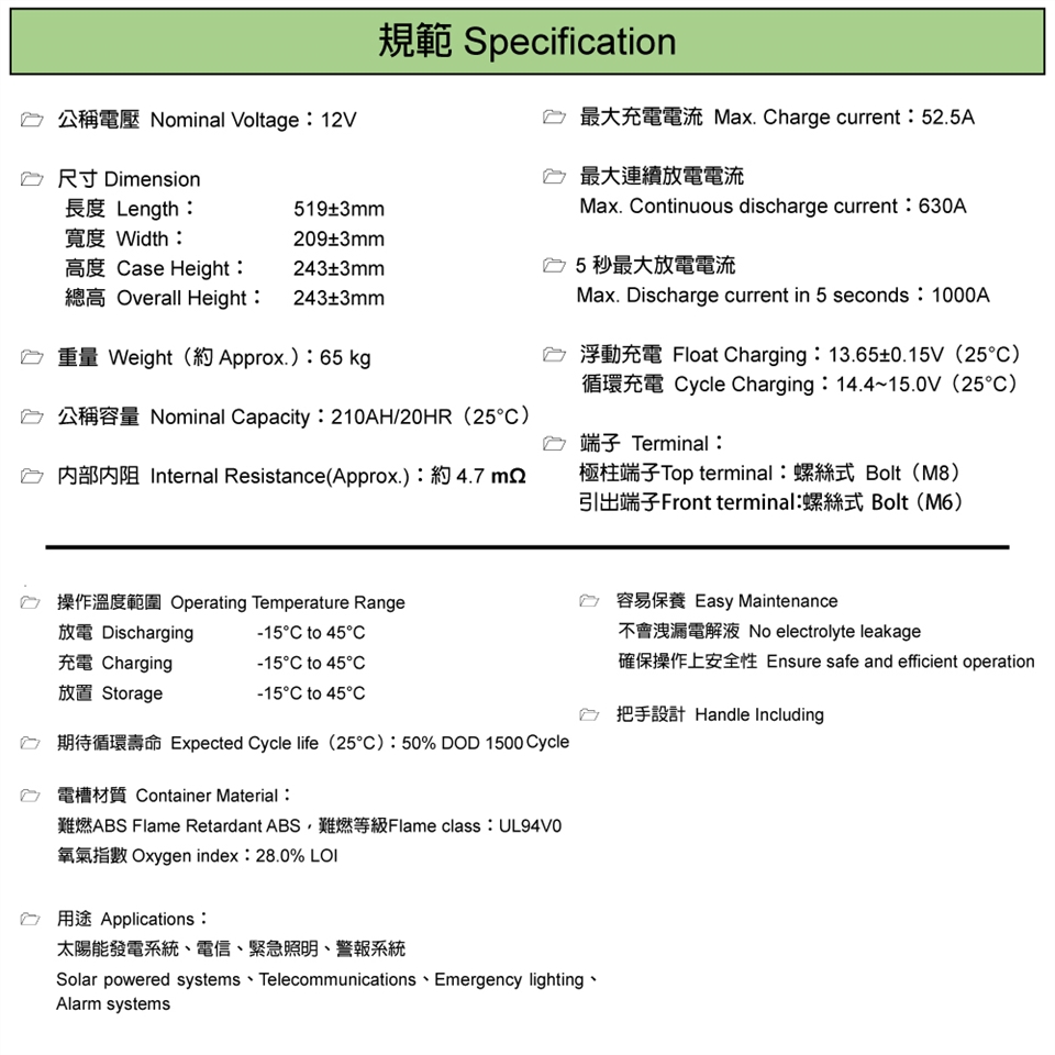 容量:210Ah / 20HR
