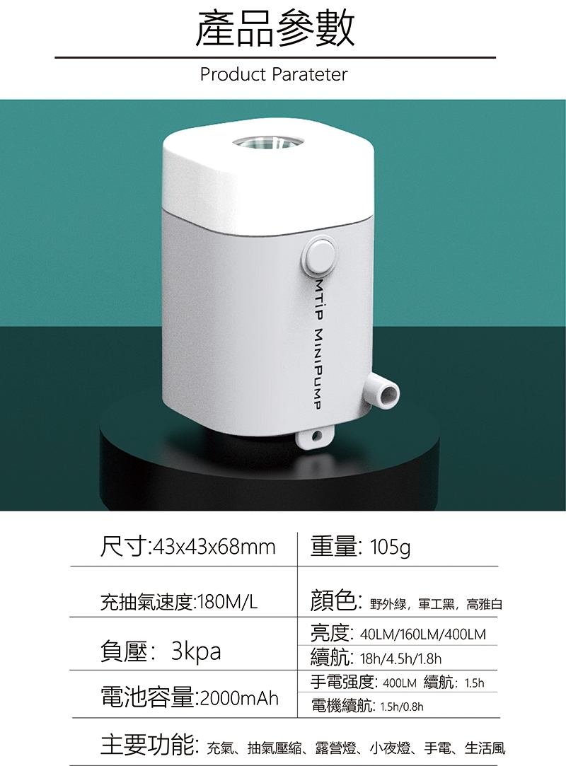 主要功能 / 充氣、抽氣壓缩、露營燈、小夜燈、手電筒