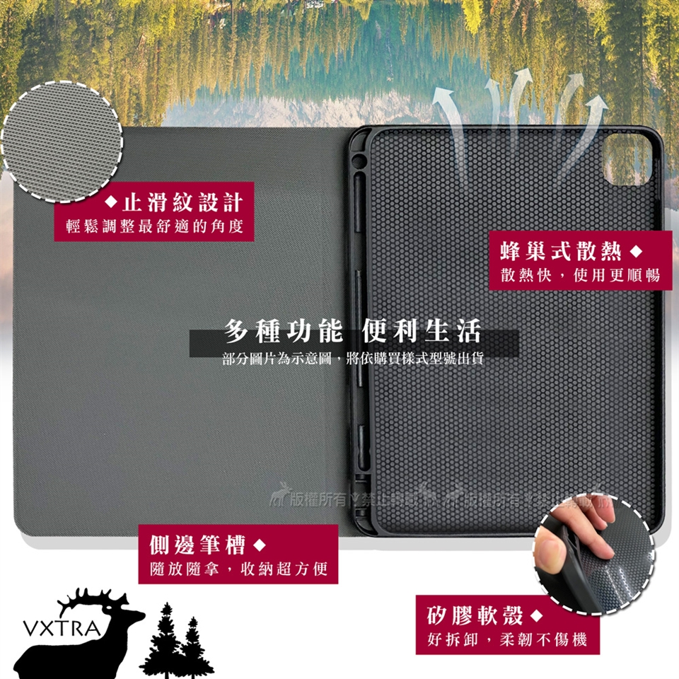 筆槽、止滑紋、矽膠軟殼、蜂巢式散熱 多種設計使用更舒適