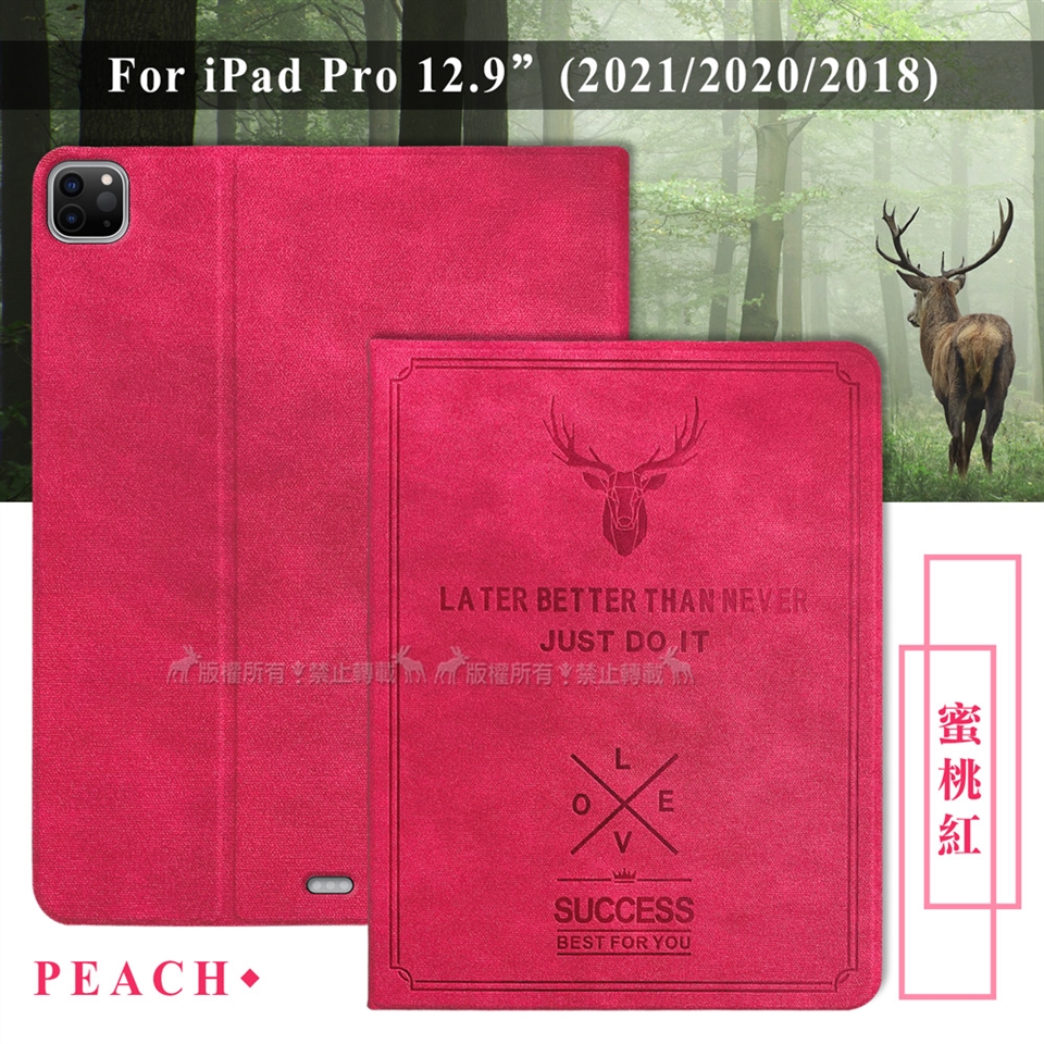 二代筆槽版 VXTRA iPad Pro 12.9吋 2021/2020/2018版通用 北歐鹿紋平板皮套 保護套(蜜桃紅)