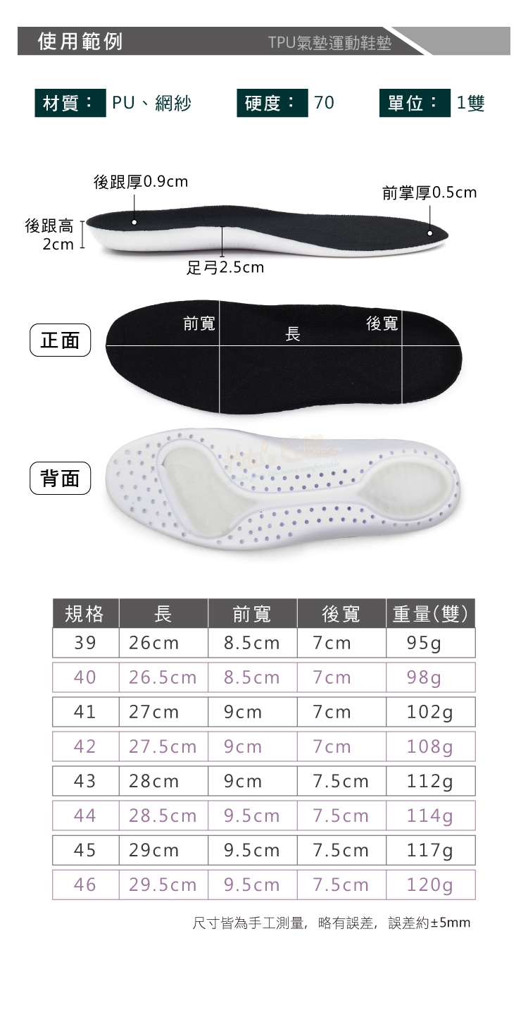 前掌厚0.5cm 後跟厚0.9cm 足弓2.5cm 後跟高2cm