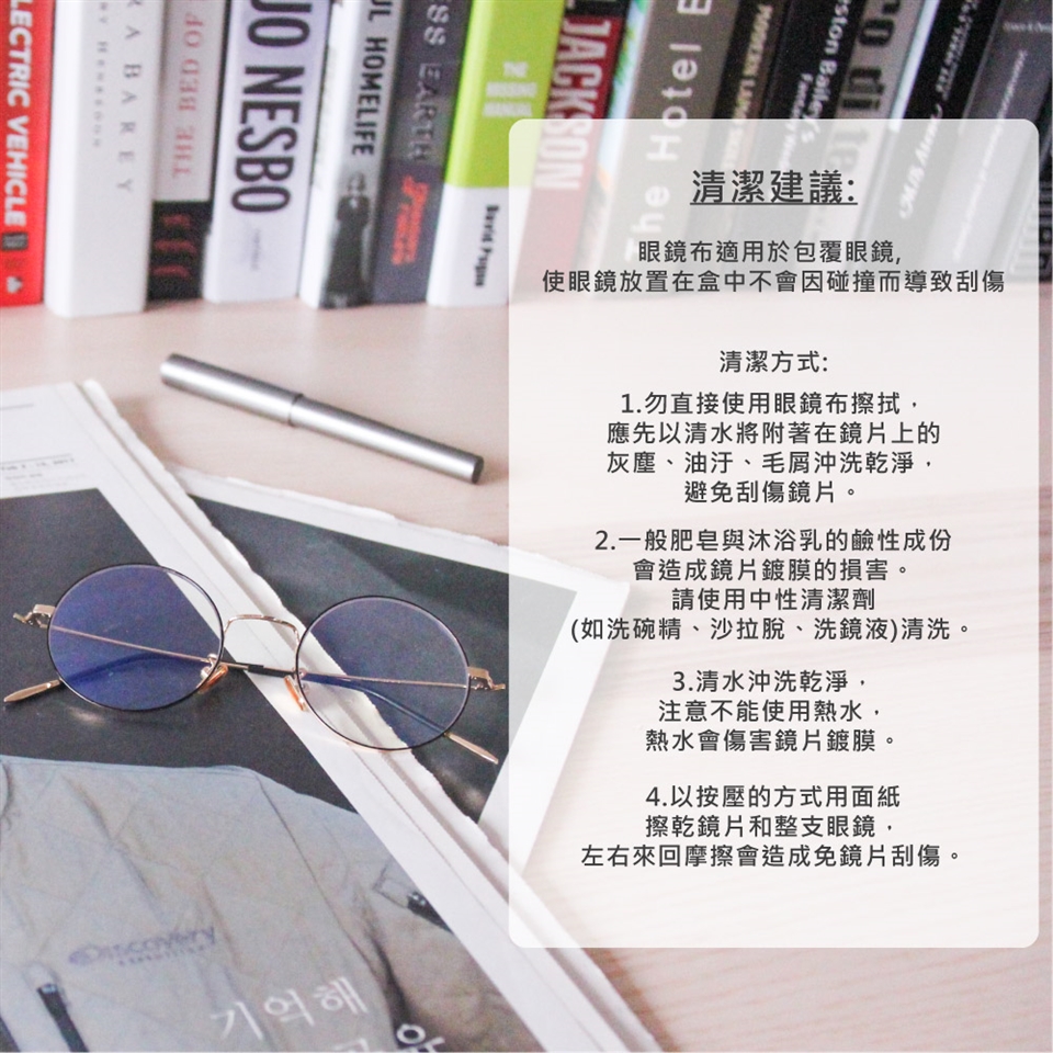 1. 眼鏡為精品配件並非珠寶類商品,鏡架稍有刮損視為正常現象並非瑕疵。 2. 網頁商品顏色會因為解析度不同,或使用不同品牌的螢幕,造成顏色略有不同,請以實品顏色為準。3. 本產品為無度數平光眼鏡,非屬醫療器材中的視力矯正處方眼鏡。 4. 鏡片清潔以清水沖洗再做擦拭,以降低鏡片刮傷的風險產生。