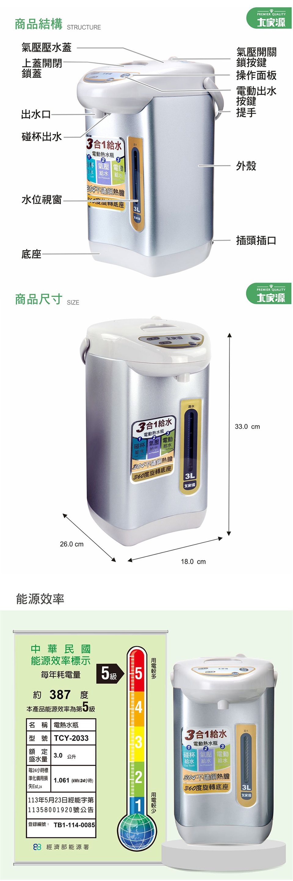 大家源 3L 電動給水熱水瓶 TCY-2033