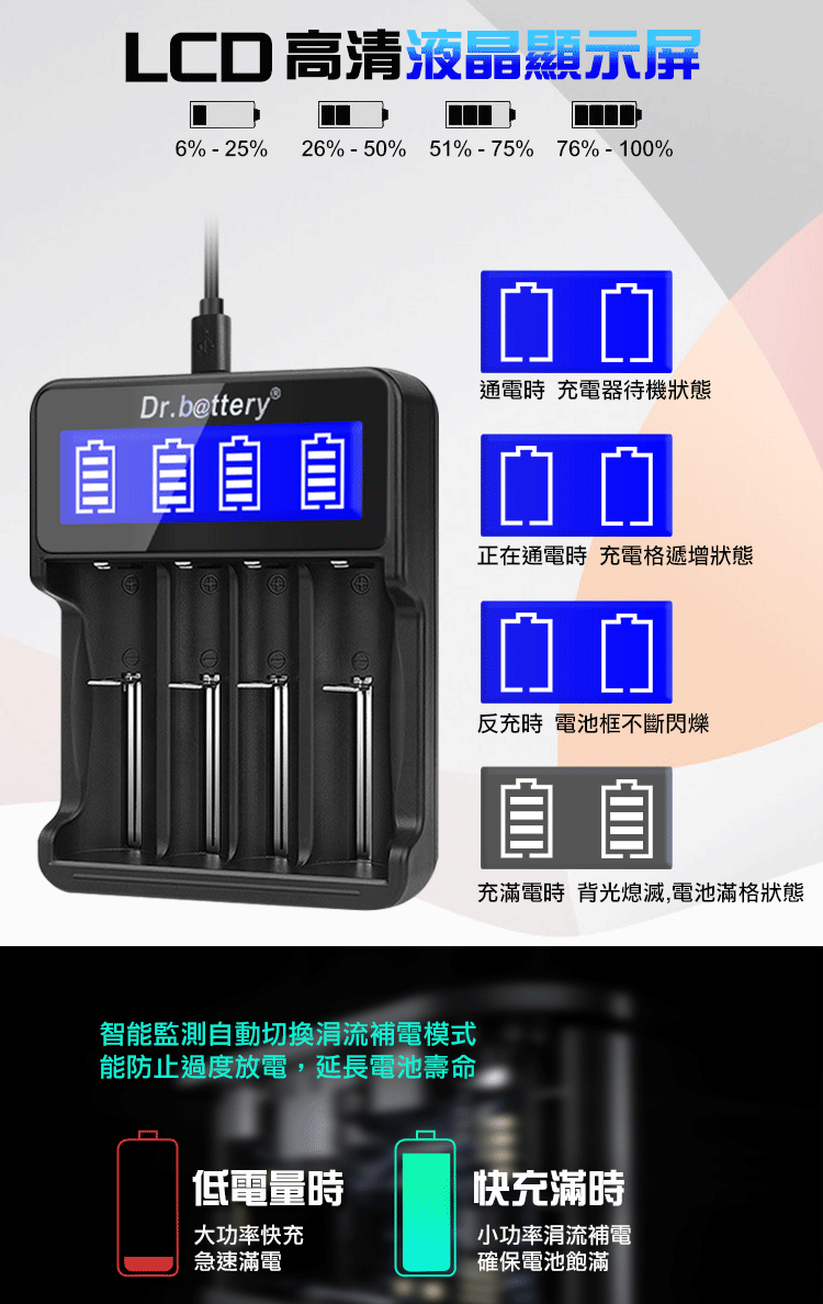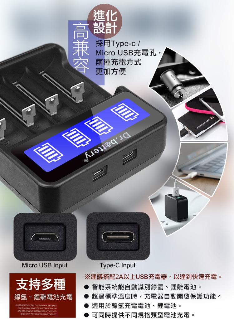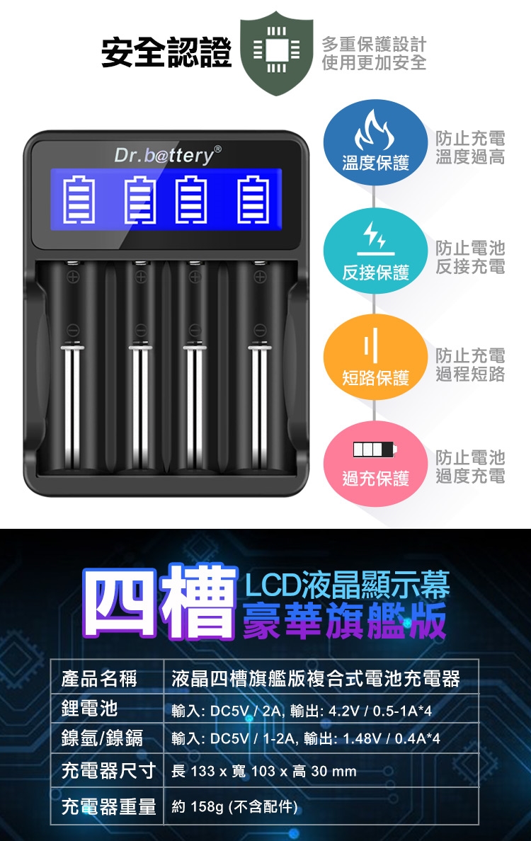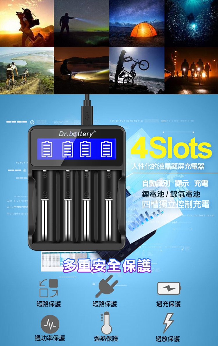 Dr.battery電池王 LCD-18650電池專用 液晶顯示四槽快速充電器
