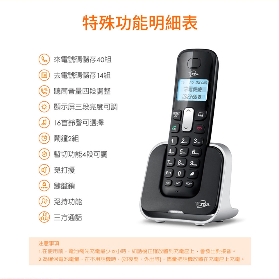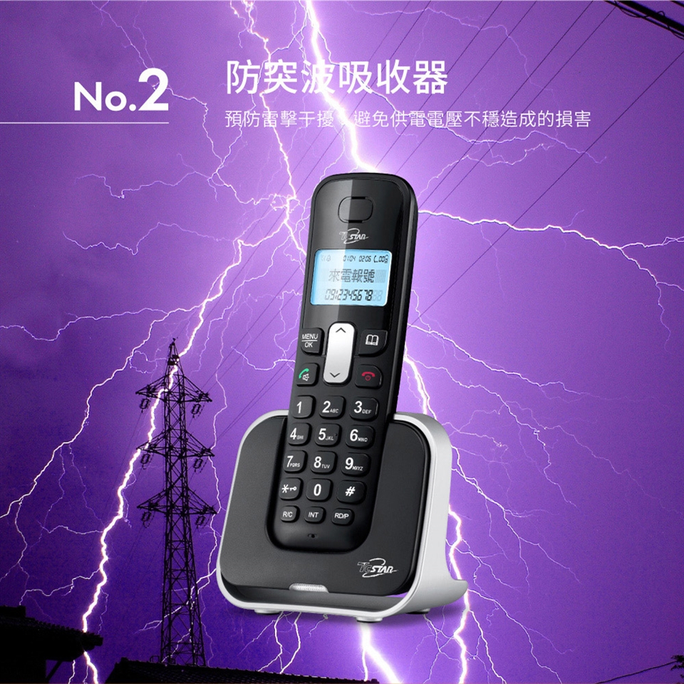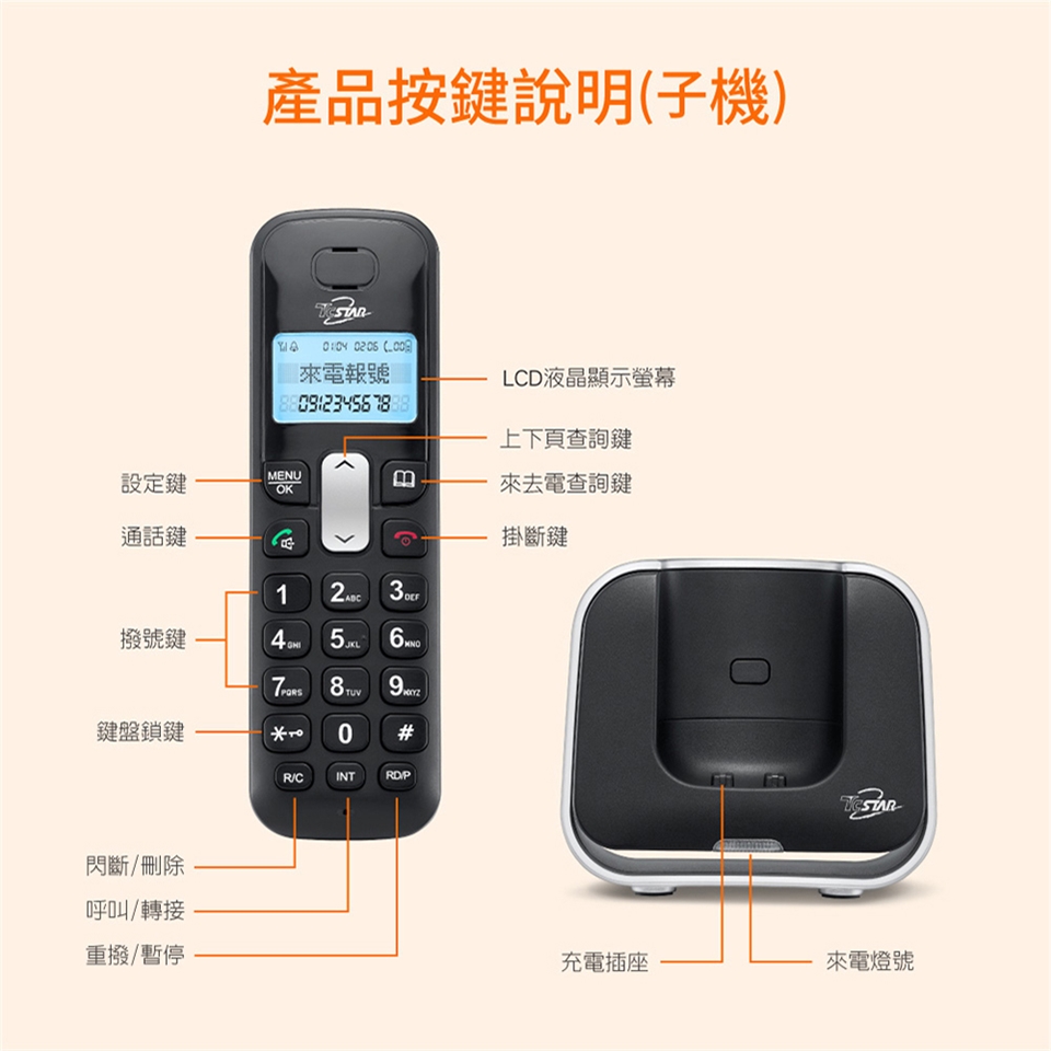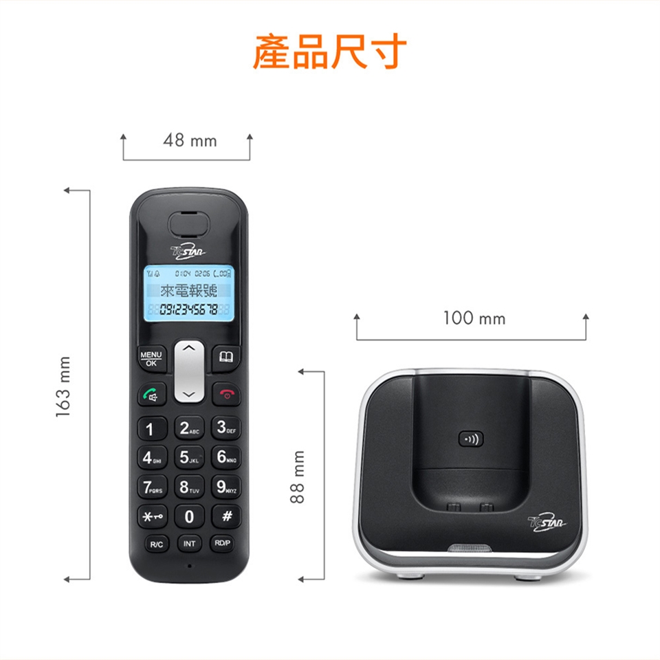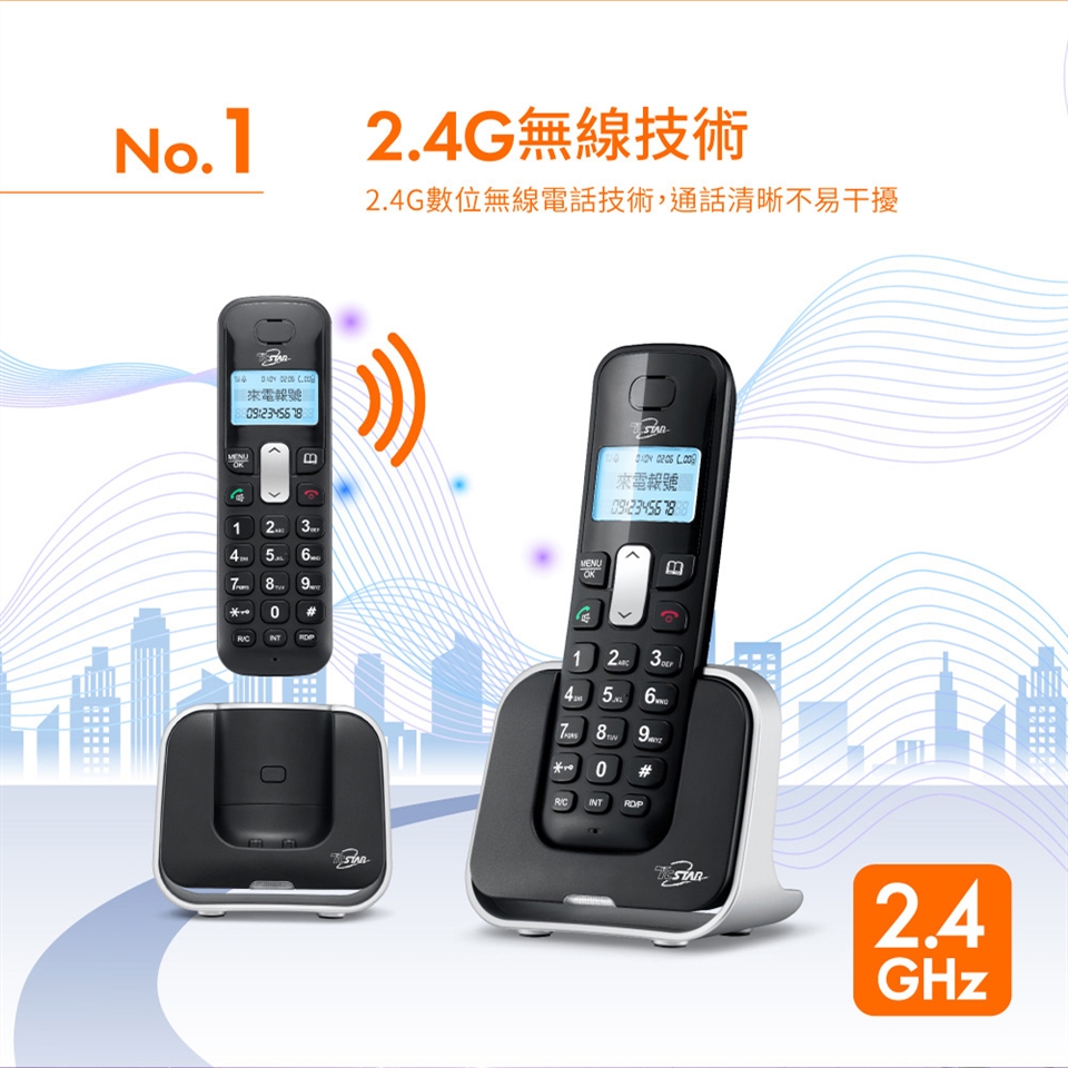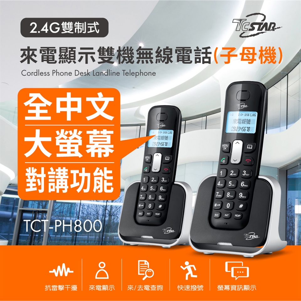 TCSTAR 2.4G雙制式來電顯示雙機無線電話 TCT-PH800BK