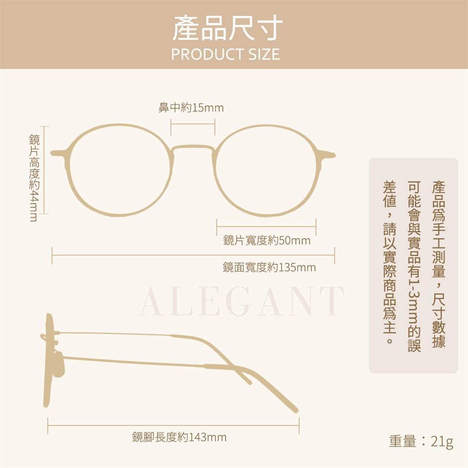 注意事項: 1. 眼鏡為精品配件並非珠寶類商品,鏡架稍有刮損視為正常現象並非瑕疵。 2. 網頁商品顏色會因為解析度不同,或使用不同品牌的螢幕,造成顏色略有不同,請以實品顏色為準。3. 本產品為無度數平光眼鏡,非屬醫療器材中的視力矯正處方眼鏡。 4. 鏡片清潔以清水沖洗再做擦拭,以降低鏡片刮傷的風險產生。