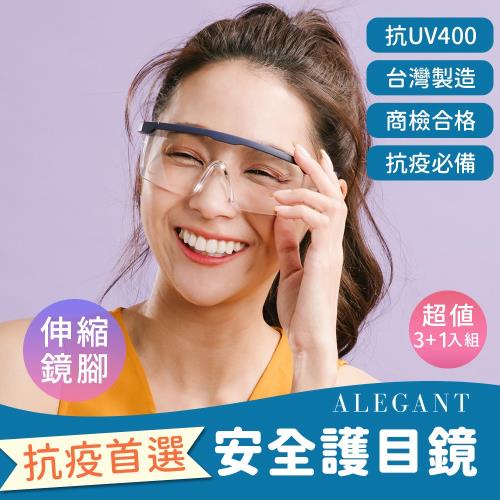 【ALEGANT】防疫霧藍框架加大鏡片伸縮鏡腳安全防護眼鏡/防護/防風-超值3+1入組(安全眼鏡/防飛沫)