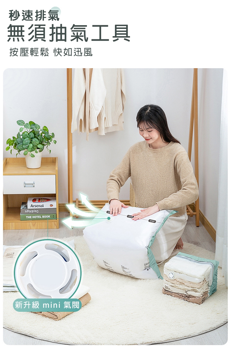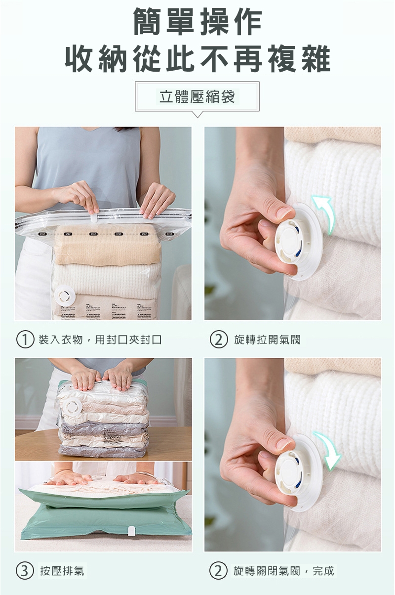 裝入寢具衣物後用密封夾封口,旋轉拉開氣閥,按壓排氣,旋轉關閉氣閥完成。