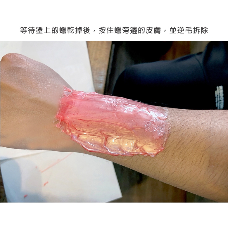 5. 等蠟全乾時繃緊皮膚,逆毛撕蠟