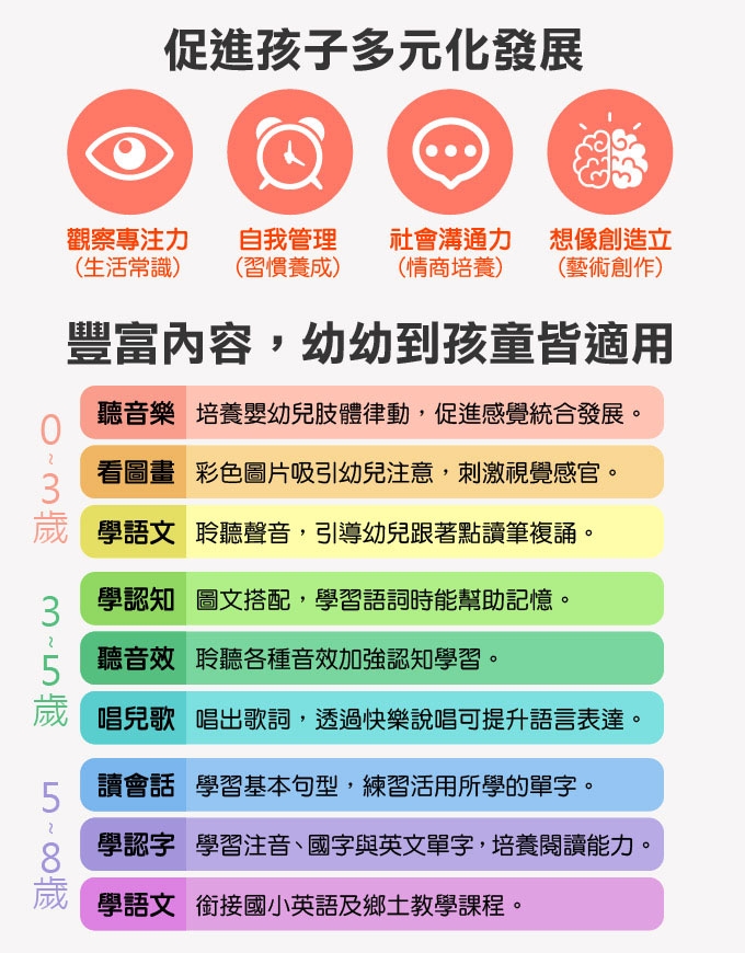★產品附贈英文字母表及台語用詞對照手冊,可點讀學習。