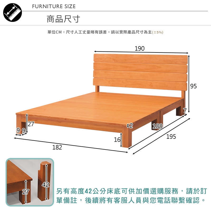 此賣場販售的腳柱高度為27公分,另有腳柱高度42公分床底可供加價選購服務,