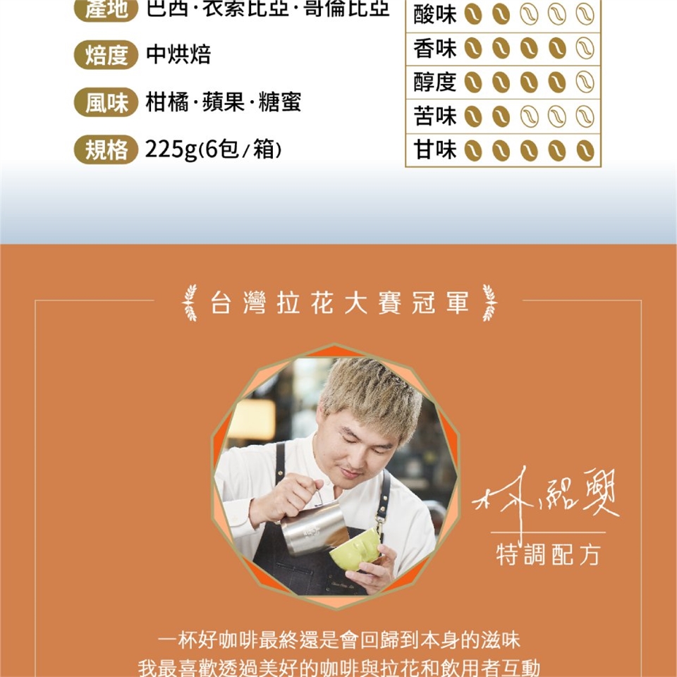 採用非洲最具特色的花香調,加上中南美洲迷人的糖蜜甘甜,融合出具有柑橘、蘋果、糖蜜風味像是熟成水果的味道,又不會太酸,適合喜歡清爽柔順風味的人。