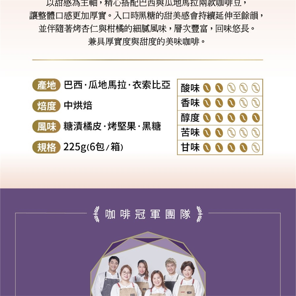 以甜感為主軸,精心搭配巴西與瓜地馬拉兩款咖啡豆,讓整體口感更加厚實。入口時,黑糖的甜美感會持續延伸至餘韻,並伴隨著烤杏仁與柑橘的細膩風味,層次豐富,回味悠長。這是一款兼具厚實度與甜度的美味咖啡。
