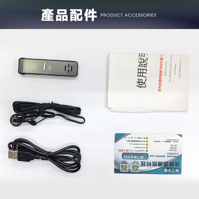 包裝內容物:錄音筆x1/充電線x1/耳機x1/保固卡x1/說明書x1