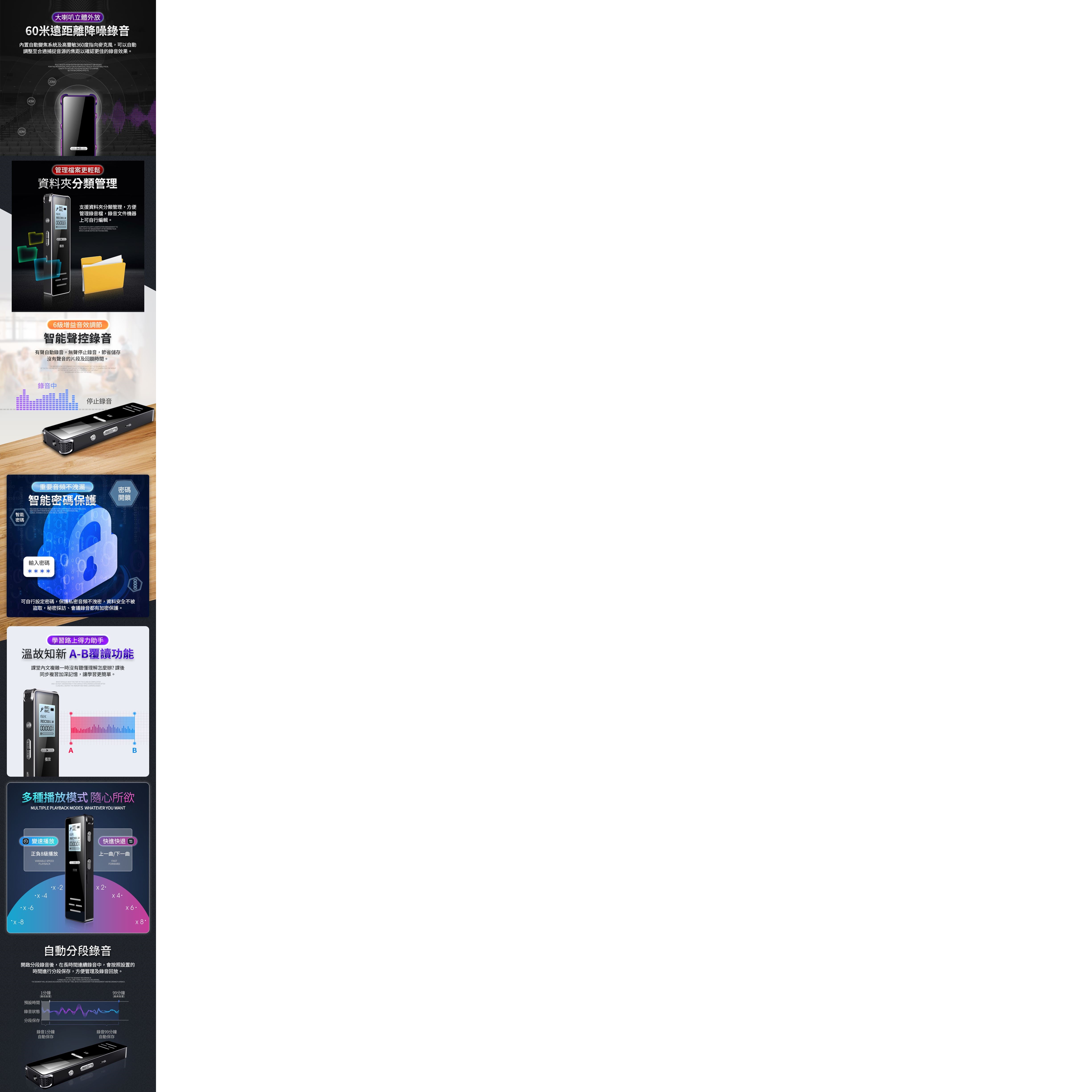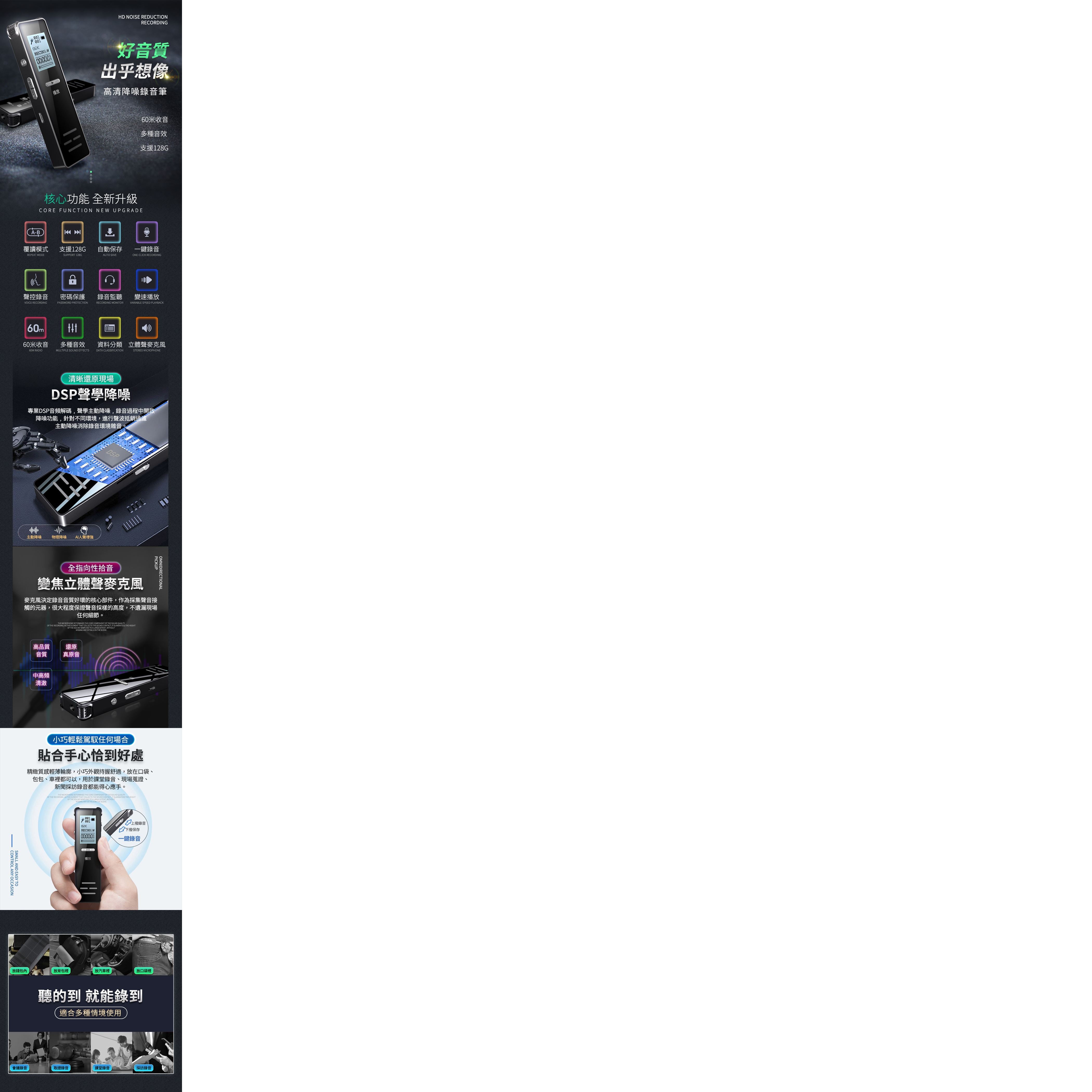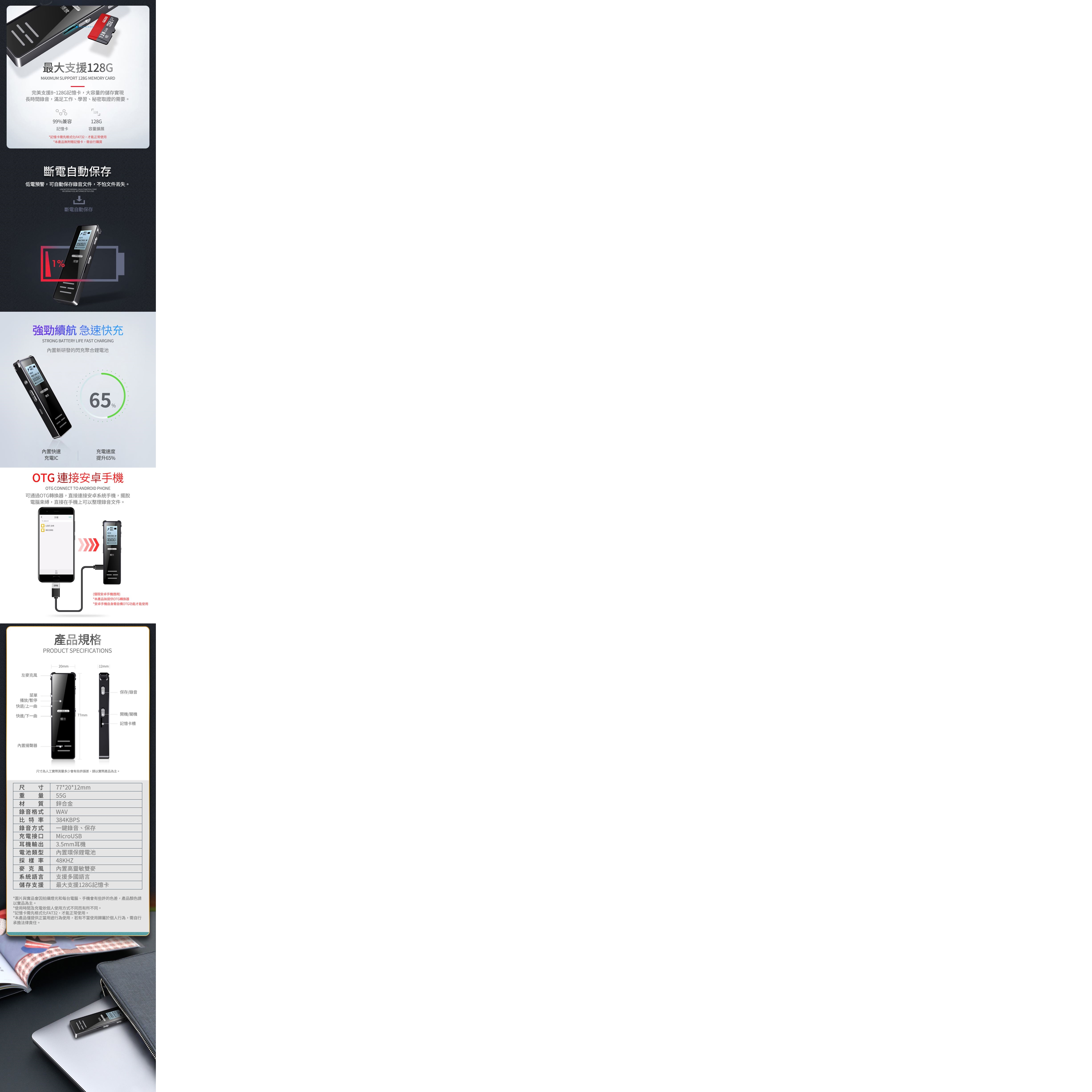 聲控錄音:支援,需大於50分貝時啟動錄音功能
