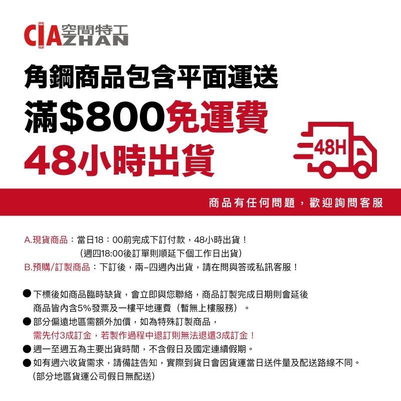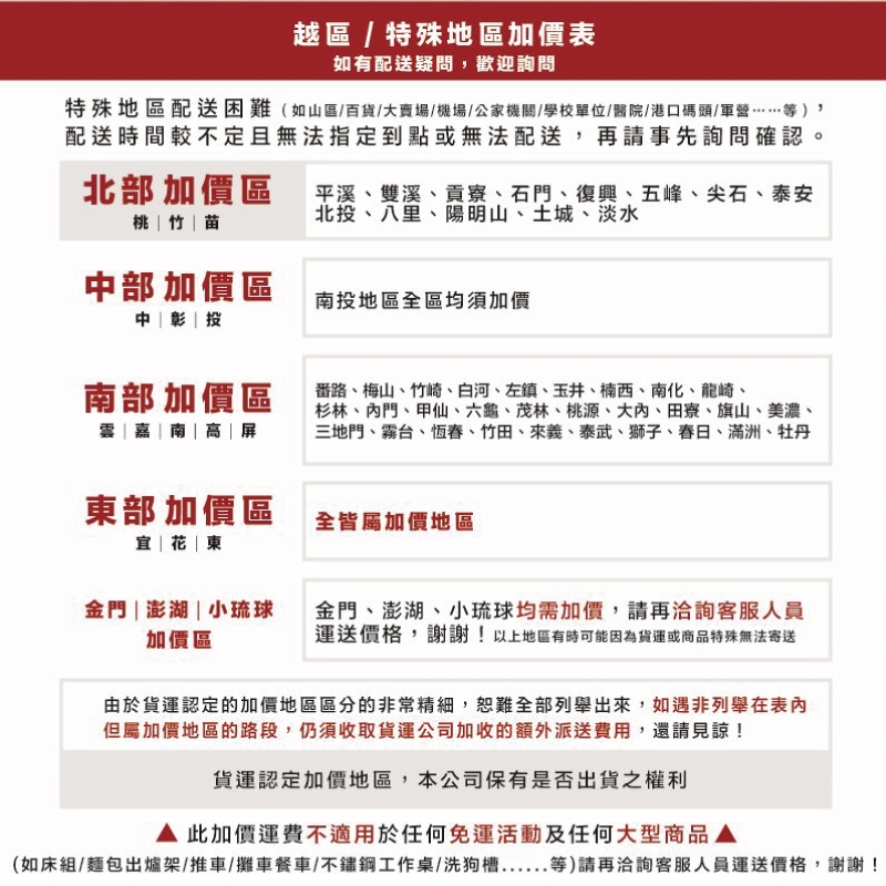 以上地區有時可能因為貨運或商品特殊無法寄送,貨運認定加價地區,本公司保有是否出貨之權利。由於貨運認定的加價地區區分的非常精細,恕難全部列舉出來,如遇非列舉在表內,但屬加價地區的路段,仍須收取貨運公司加收的額外派送費用,還請見諒!此加價運費不適用於任何免運活動及任何大型商品,如床組/麵包出爐架/推車/攤車餐車/不鏽鋼工作桌/洗狗槽......等,請再洽詢客服人員運送價格,謝謝!