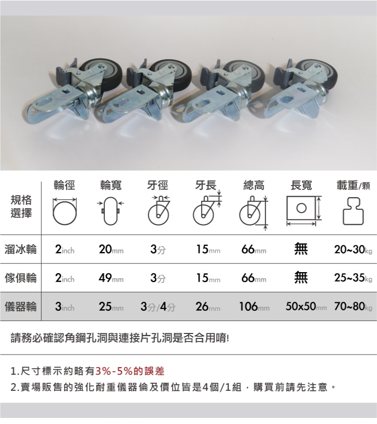 請確認輪子的螺牙與鐵管的螺牙是否相同,以及角鋼孔洞與連接片孔洞是否合用喔