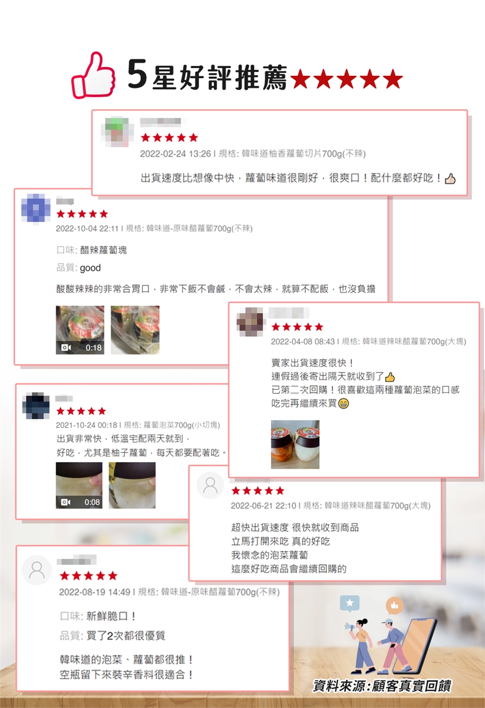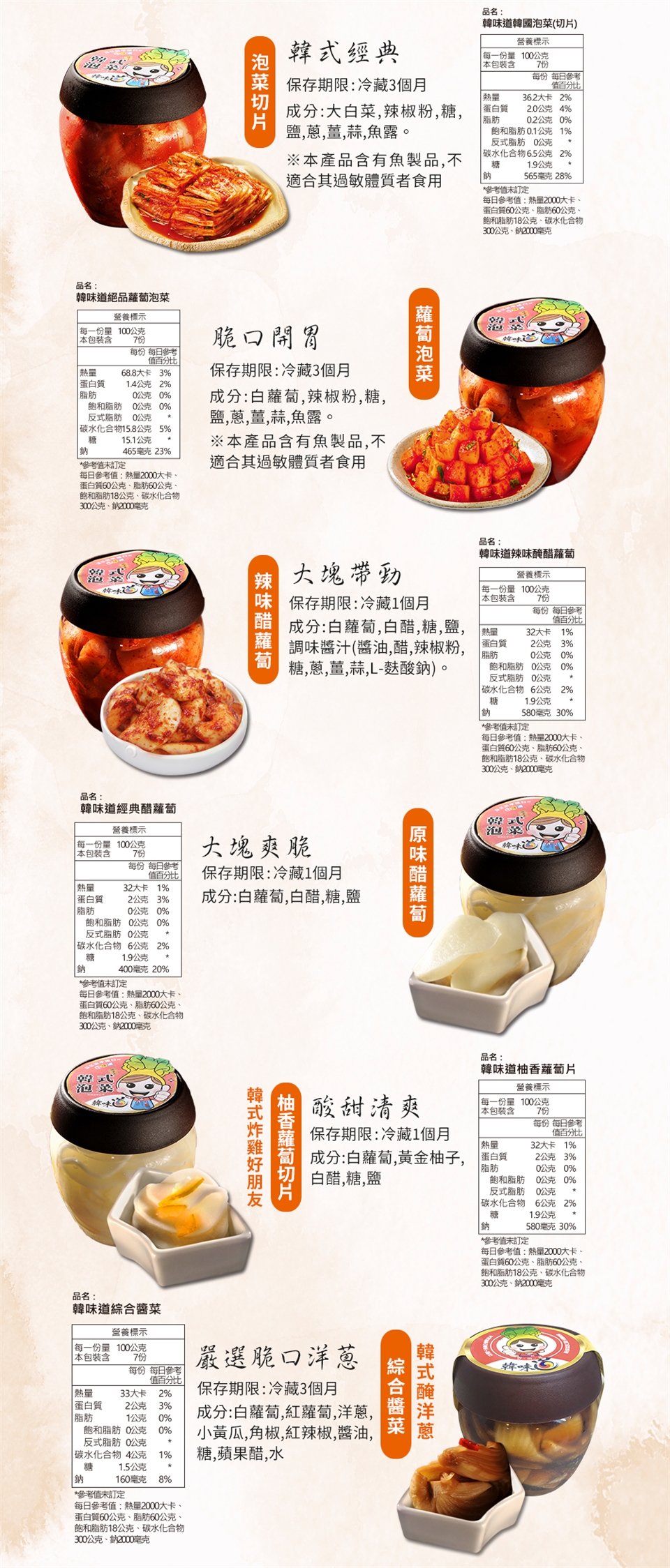 ※請冷藏0~7度C,食用時請以乾淨器具夾取食用,泡菜變酸乃為正常發酵現象,開封後請盡速食用,以保持最佳風味