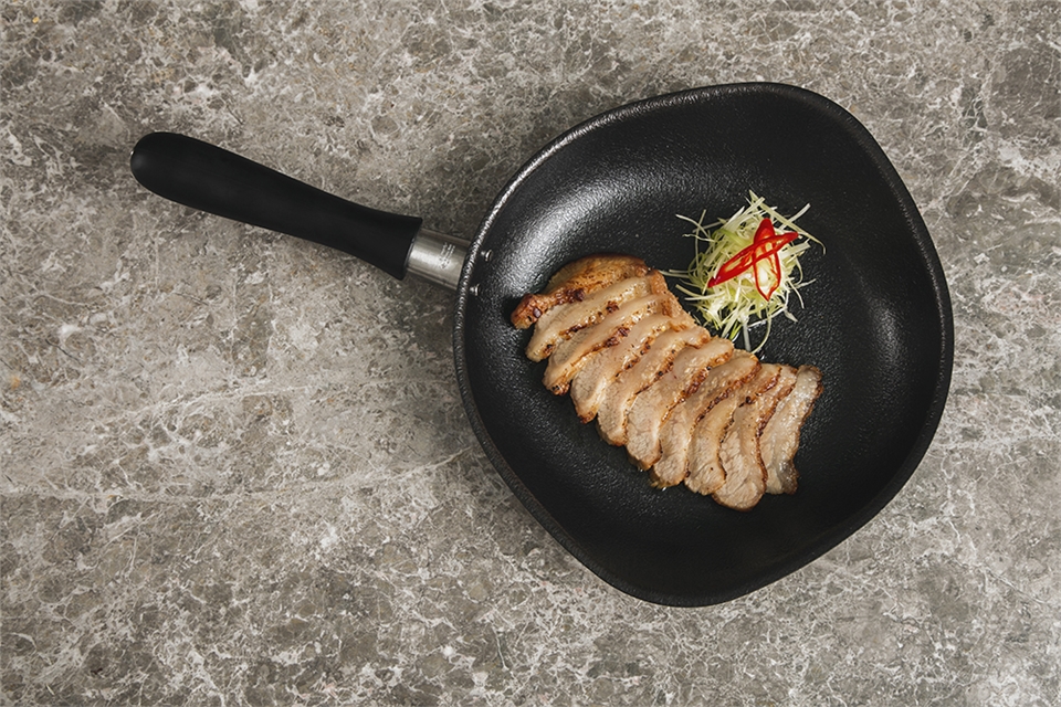 特殊浮雕紋路雙面加工,內側可形成不易沾鍋的效果即將多餘油脂做適度的隔離,外側因為表面積變大,熱傳導速度比一般鐵鍋更快,符合人體工學握把設計與輕薄的鍋身,同樣是鐵鍋拿起來卻毫不費力。