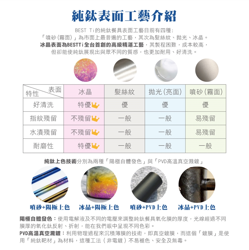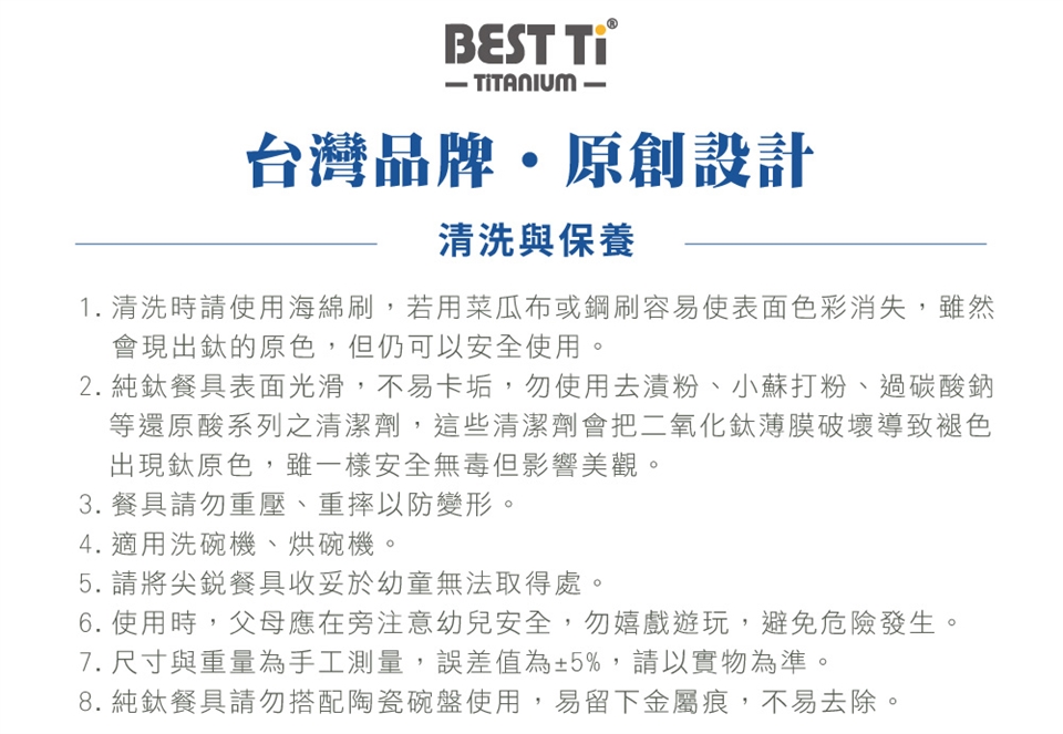 2.純鈦餐具表面光滑,不易卡垢,勿使用去漬粉、小蘇打粉、過碳酸鈉等還原酸系列之清潔劑,這些清潔劑會把二氧化鈦薄膜破壞導致褪色,出現鈦原色(鈦原色商品不會再褪色),雖一樣安全無毒但影響美觀。